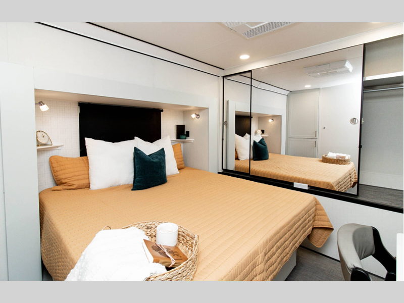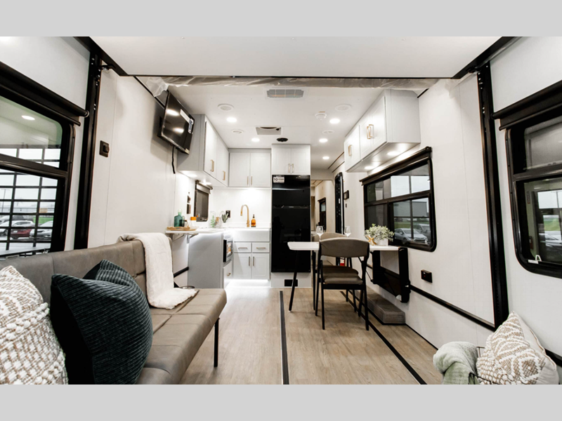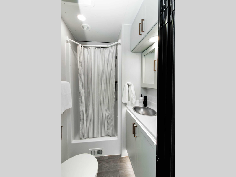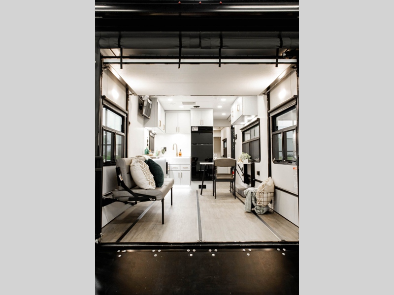 The LifeTrac Modular Component System and garage tie-downs will let you configure your space for furniture, toys, gear, and more! There is composite and commercial-grade vinyl flooring inside, along with aluminum cabinets and solid surface countertops, glass shower doors, and a residential bed for all-around comfort. The exterior is just as accommodating with its pass-through storage, power awning with LED lights, stabilizer system and electric tongue jack to name a few conveniences!