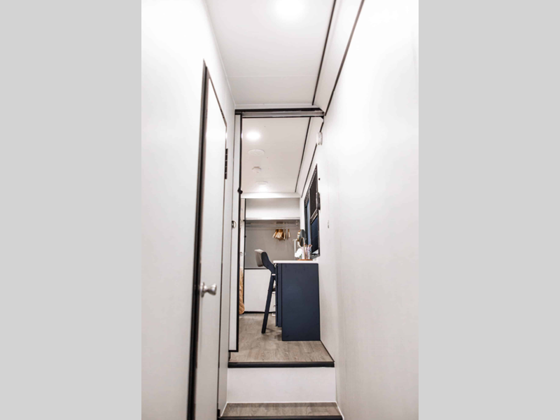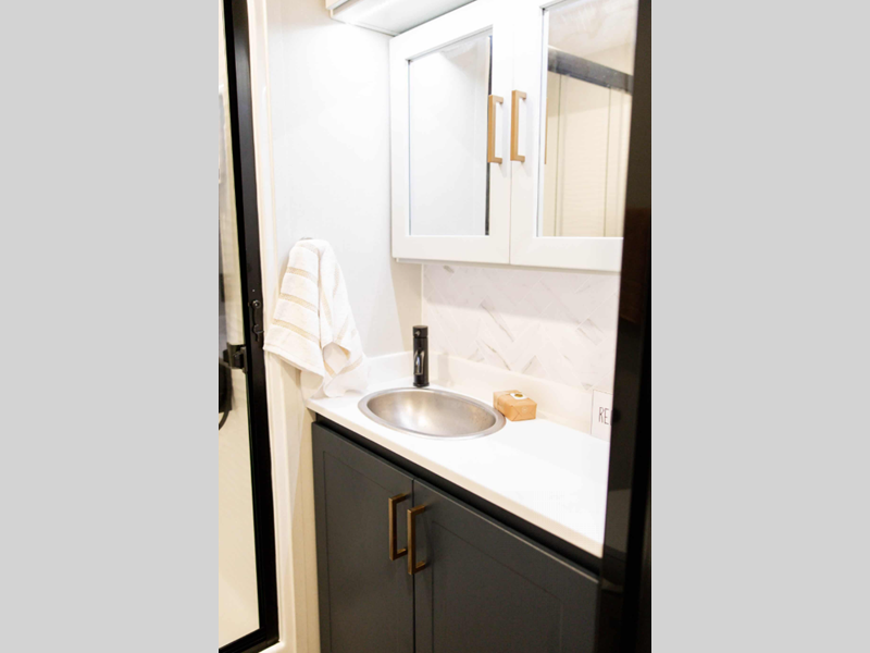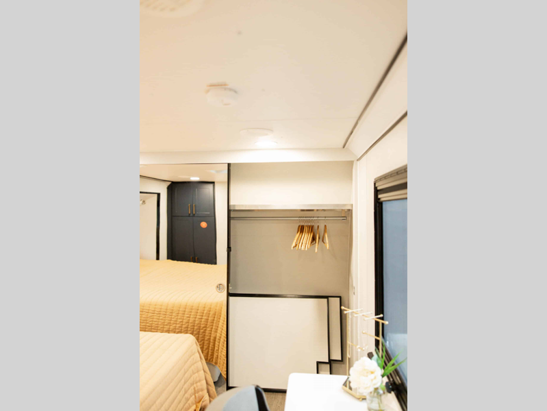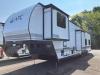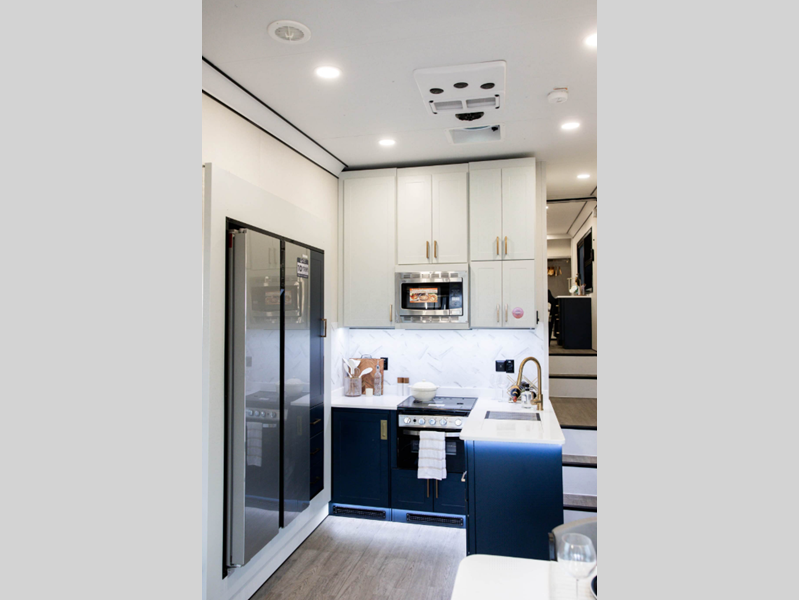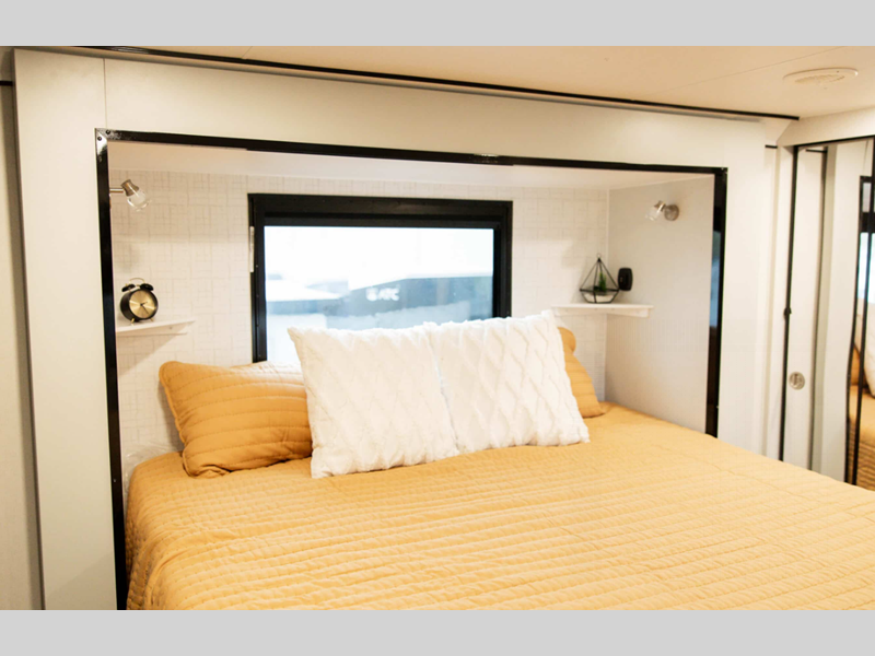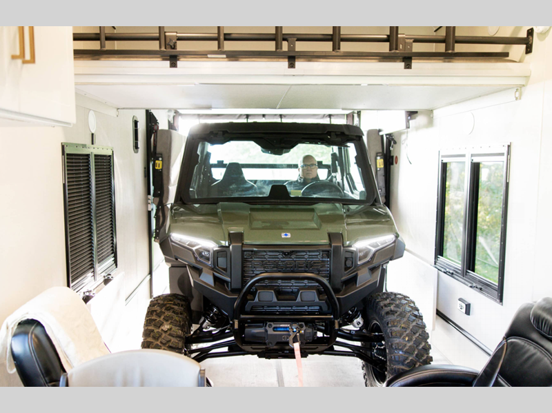 The LifeTrac Modular Component System and garage tie-downs will let you configure your space for furniture, toys, gear, and more! There is composite and commercial-grade vinyl flooring inside, along with aluminum cabinets and solid surface countertops, glass shower doors, and a residential bed for all-around comfort. The exterior is just as accommodating with its pass-through storage, power awning with LED lights, hydraulic leveling system, and a GenY Hitch to name a few conveniences.