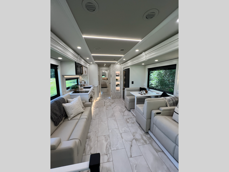 The durable all-steel, welded cage construction and all-steel tubular floor frame will provide a strong foundation to your coach, and there is a 100% one-piece walk-on roof for added durability. You will also appreciate the 3-piece fiberglass rear cap, the exterior hot/cold shower in the wet bay, plus lighted storage compartments with push button doors and power remote locking. Inside, you'll be met with Villa furniture, porcelain heated tile throughout, power roller day/night shades, and Quartz countertops with backsplash in the kitchen to name a few luxuries.