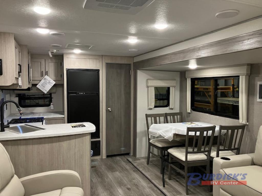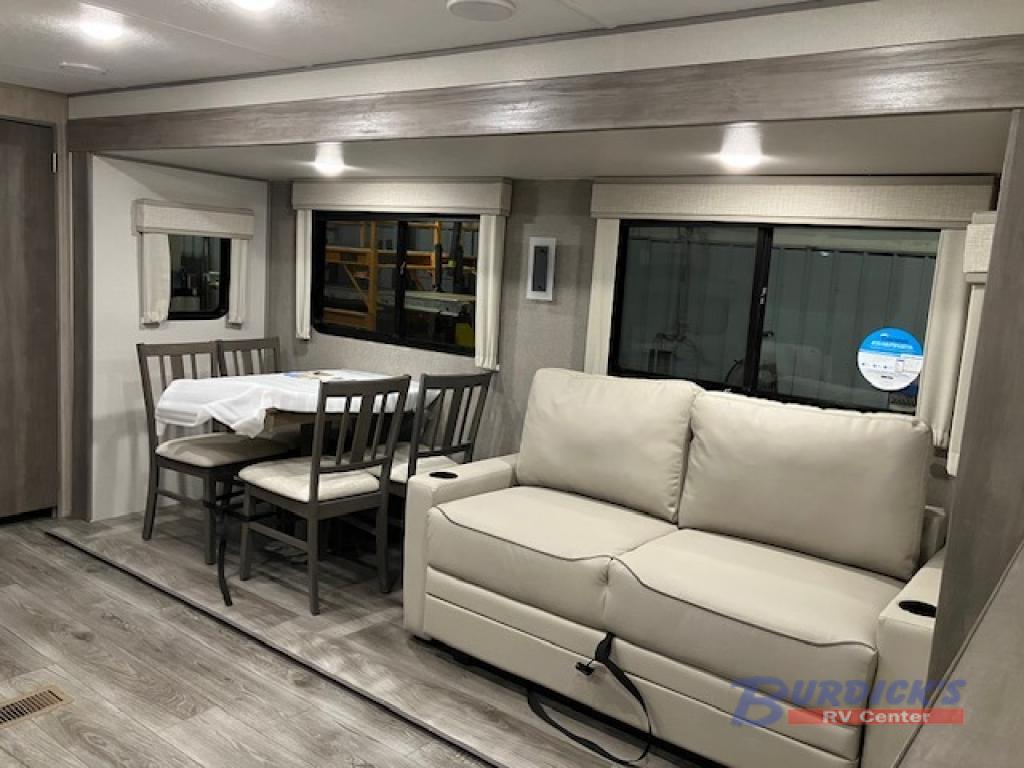 Whether you camp to relax indoors or play outdoors, this trailer offers interior comforts for a couple or a family of four! From the spacious rear kitchen thanks to the large slide out that includes a booth dinette and sofa. Yet you might like to choose the free standing dinette option in place of the dinette or the theater seating in place of the sofa. The U-shaped counter offers plenty of space to dry dishes and prep meals. There is a 10.7 cu. ft. GE stainless 12V refrigerator and a walk-in pantry for food storage, and everyone can enjoy the entertainment center with a fireplace option below while cooking, cleaning, dining and relaxing. And the dual lounge chairs will probably be popular seats. At night head to the front bedroom to sleep on the walk-around queen bed after stopping off at the full bathroom to get cleaned up.