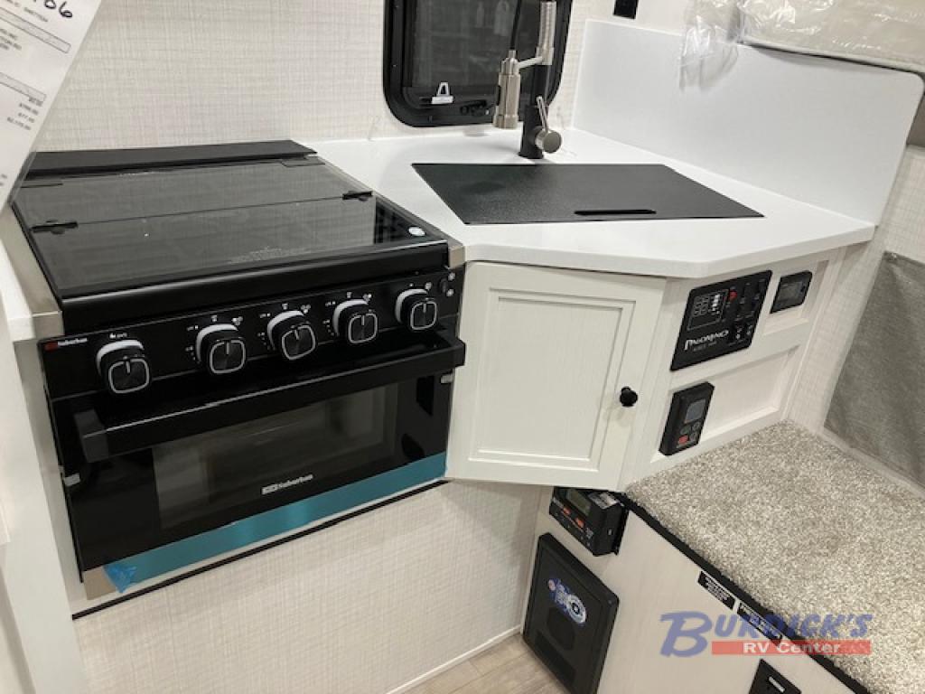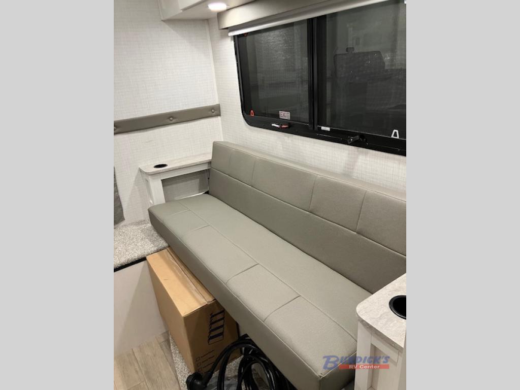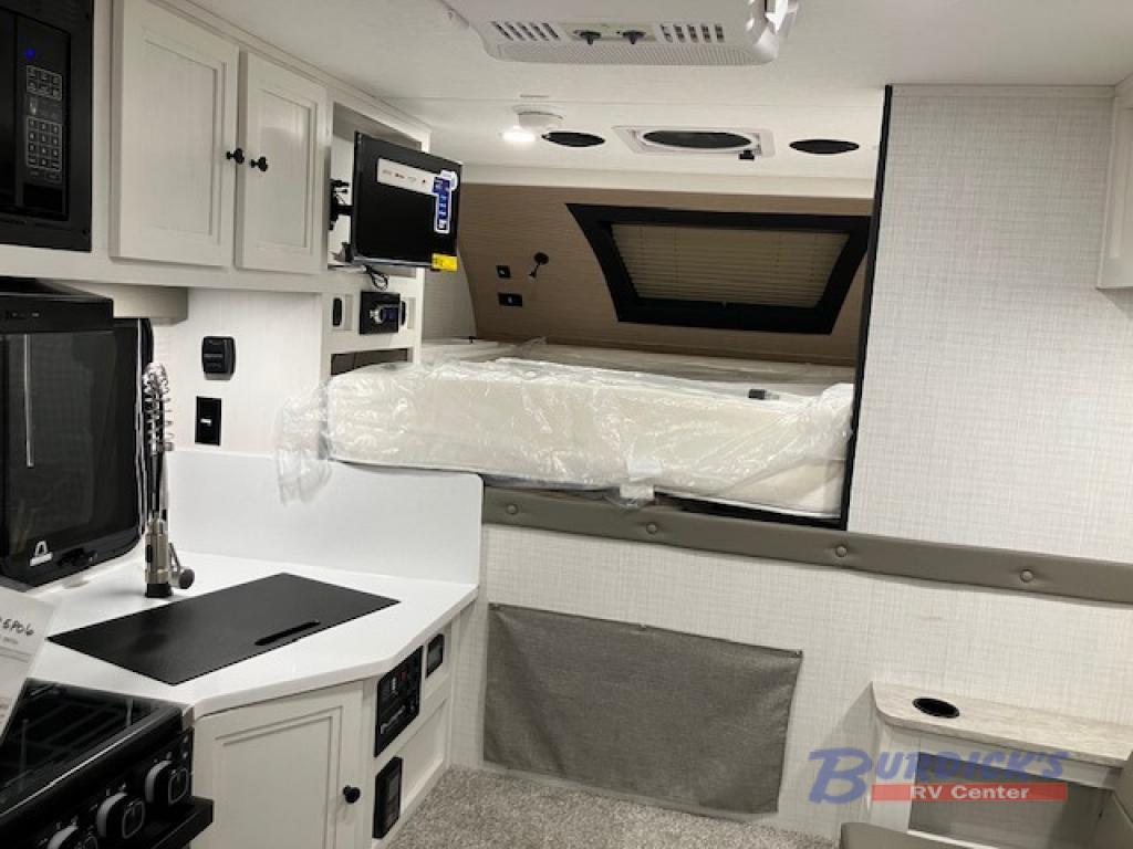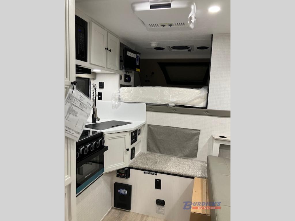 Pick your favorite fishing spot and load up this hard side truck camper! You can fry your catch of the day on the cooktop and enjoy a cold beverage from the refrigerator while you cook it. The 60" jackknife sofa offers a comfortable place for an afternoon nap or for an extra guest to sleep at night while you sleep on the front queen bed which has a wrap around nightstand, storage chests on either side, and a closet to keep your clothes wrinkle-free. If you're needing more sleeping space, you might consider adding the optional drop-down bunk above the sofa!