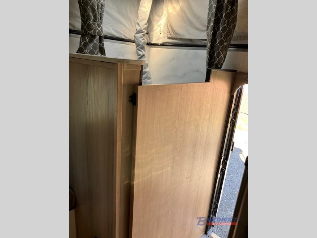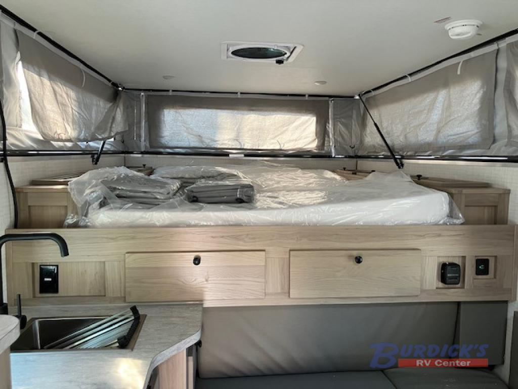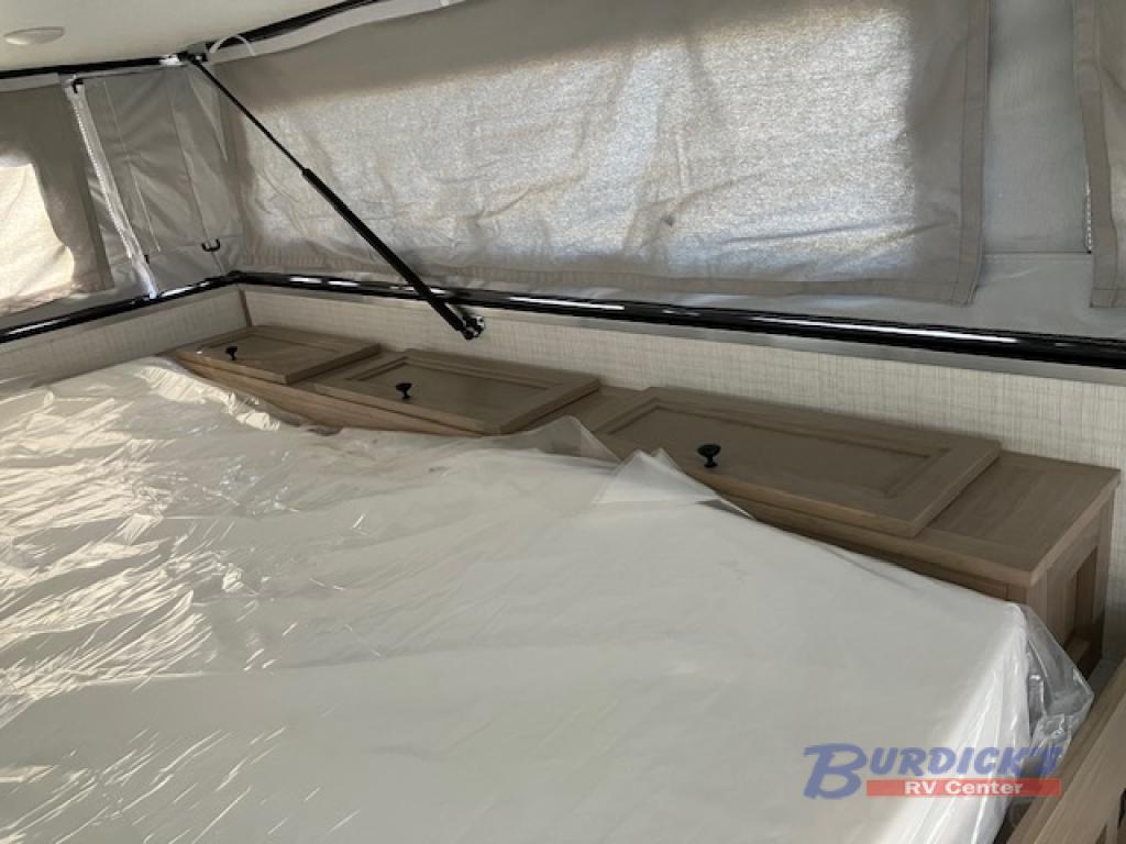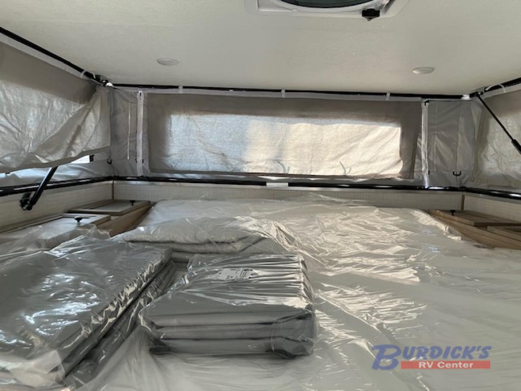 Make the most of all your adventures with this soft side truck camper! Start each morning feeling recharged after sleeping on the front queen bed with foot lockers and bedroom storage on either side of it, and freshen up in the wet bath with storage to keep your towel nearby. There is storage across from the bathroom for your canned goods, a refrigerator to keep your perishables fresh, and a two burner cooktop to prepare your best meals. Enjoy your meals at the seating area with a table then grab a board game from the storage area under the seating!