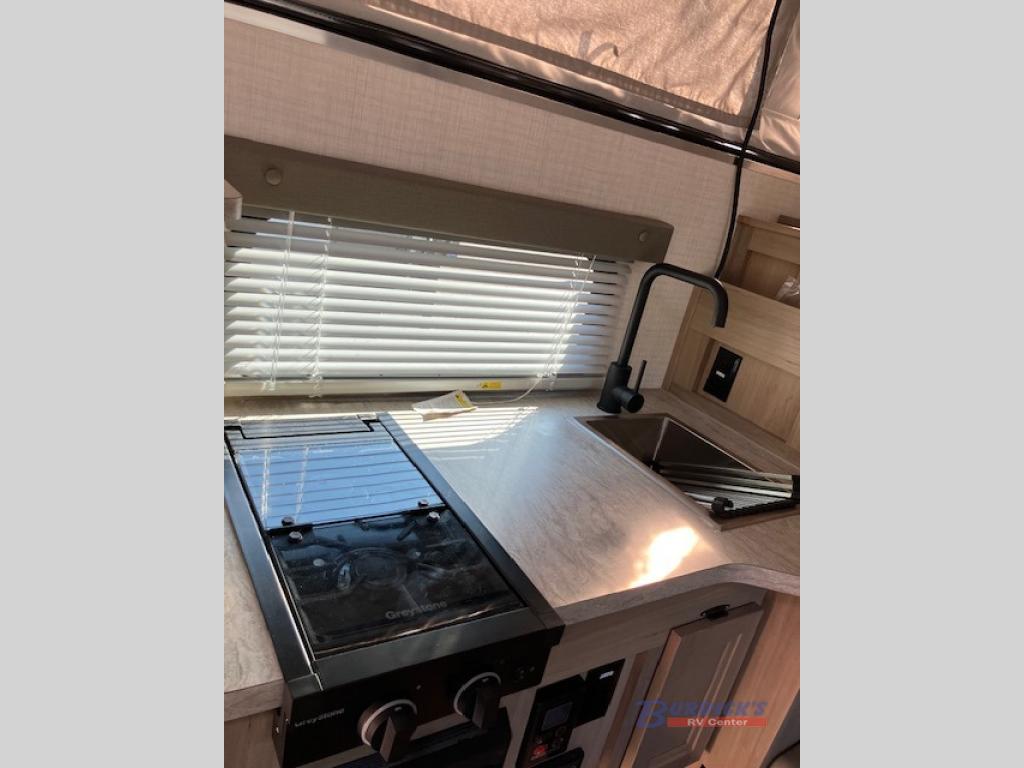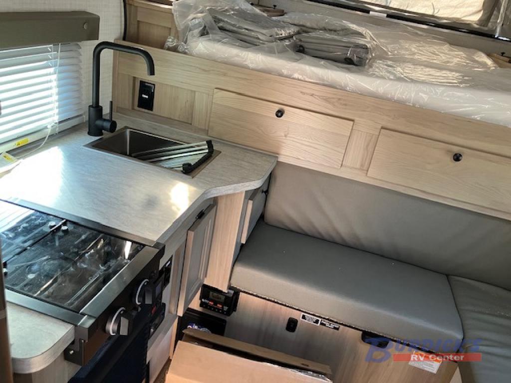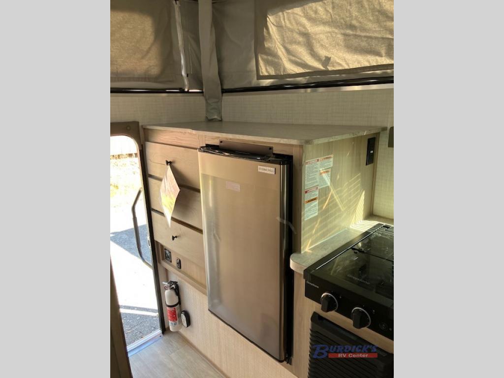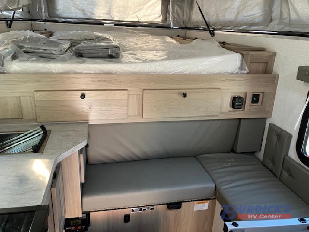 Make the most of all your adventures with this soft side truck camper! Start each morning feeling recharged after sleeping on the front queen bed with foot lockers and bedroom storage on either side of it, and freshen up in the wet bath with storage to keep your towel nearby. There is storage across from the bathroom for your canned goods, a refrigerator to keep your perishables fresh, and a two burner cooktop to prepare your best meals. Enjoy your meals at the seating area with a table then grab a board game from the storage area under the seating!
