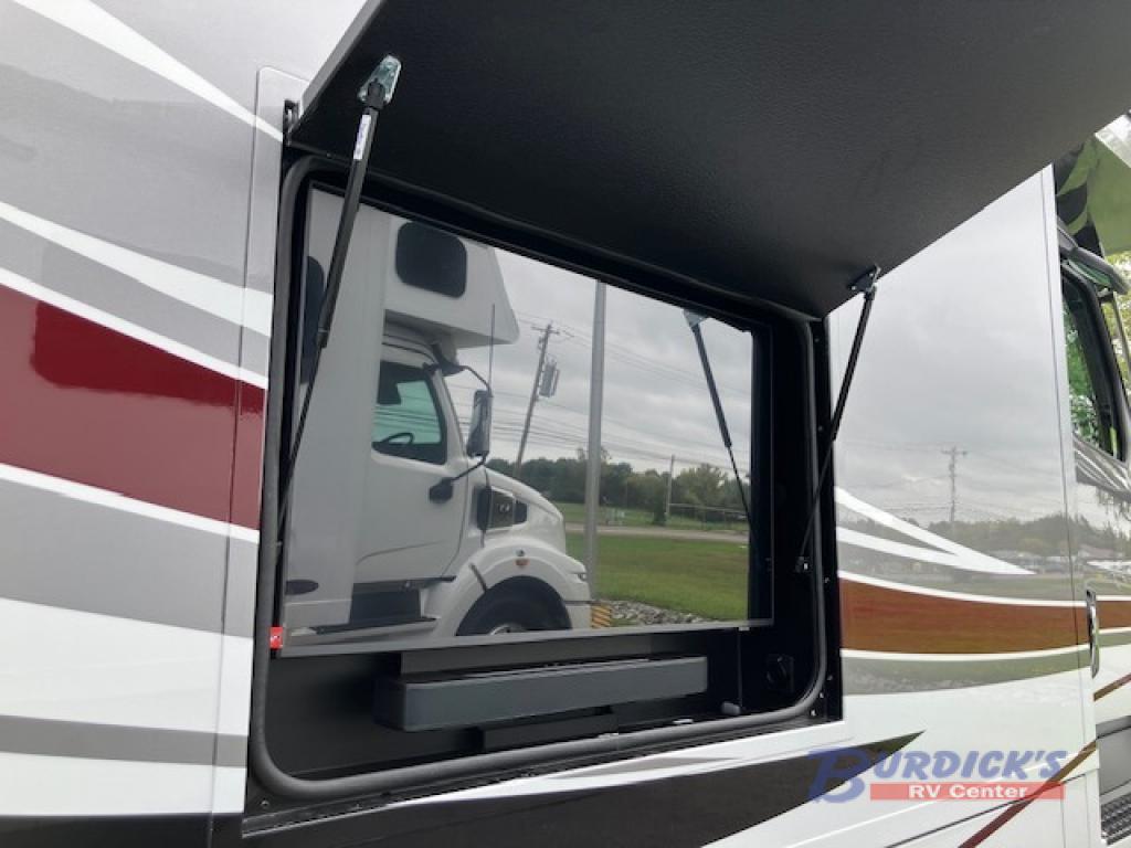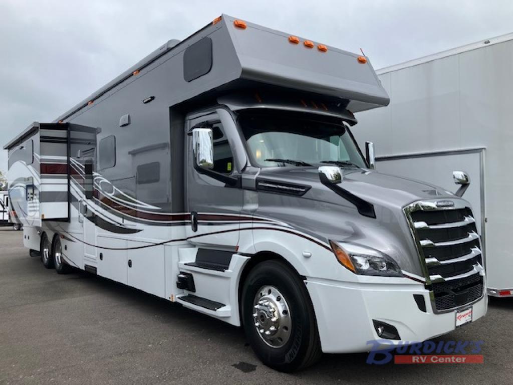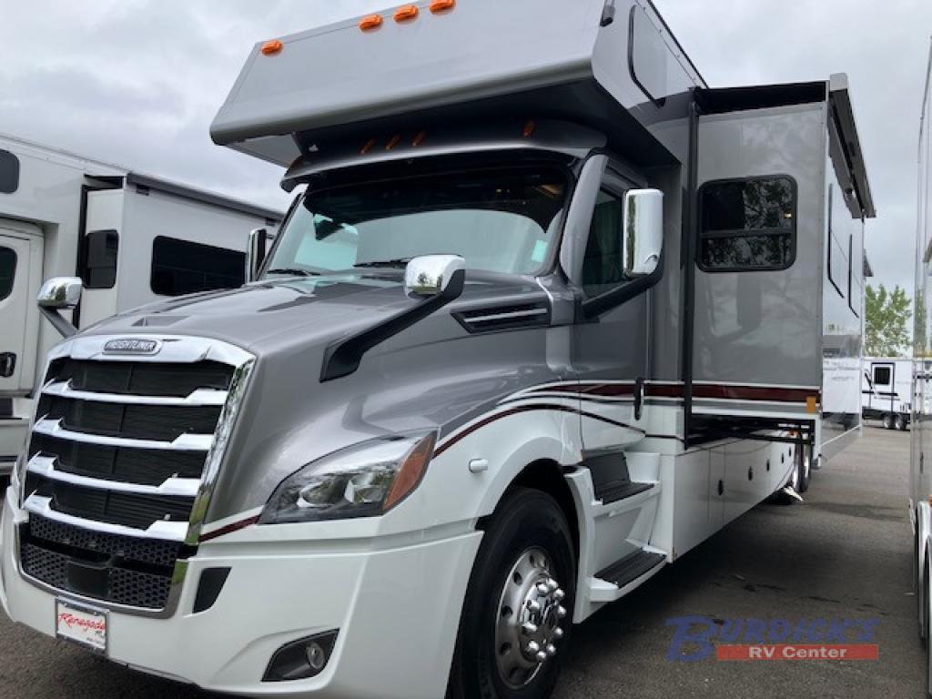With any Renegade Classic Super C diesel motorhome toy hauler motorhome you will enjoy luxury and versatility at every turn! First, choose between four chassis options that include a Freightliner Cascadia, Volvo VNR/VNL, Western Star, or a Peterbilt! Then you can choose from three stylish decor options and a wide variety of floorplan layouts to fit your needs. Each coach includes "Super Sandwich" floor construction, a roof mounted lateral 2-stage lateral arm awning with LED lights, and frameless dual pane tinted windows with screens. You will find the Multiplex electrical system convenient when managing your units functions, and you'll stay powered up by the Onan quiet diesel generator, (2) 330ah AGM house batteries, and 3000-watt pure sine wave inverter! You will love the luxury interior with its grouted tile backsplash in the galley, memory foam mattress in the bedroom, and solid surface shower with wall tile inlay and a sliding glass door in the bath. There are also color rear and side view cameras for easy maneuvering and a rear air suspension for the smoothest ride around!