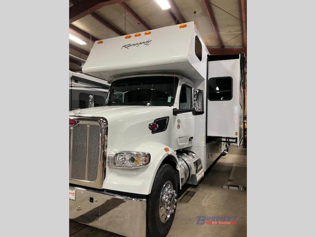 With any Renegade Classic Super C diesel motorhome toy hauler motorhome, you will enjoy luxury and versatility at every turn! First, choose between four chassis options that include a Freightliner Cascadia, Volvo VNR/VNL, Western Star, or a Peterbilt! Then you can choose from three stylish decor options and a wide variety of floorplan layouts to fit your needs. Each coach includes "Super Sandwich" floor construction, a roof mounted lateral 2-stage lateral arm awning with LED lights, and frameless dual pane tinted windows with screens. You will love the luxury interior with its grouted tile backsplash in the galley, memory foam mattress in the bedroom, and solid surface shower with wall tile inlay and a sliding glass door in the bath. There are also color rear and side view cameras for easy maneuvering and a rear air suspension for the smoothest ride around!