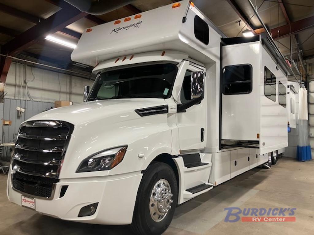 With any Renegade Classic Super C diesel motorhome toy hauler motorhome, you will enjoy luxury and versatility at every turn! First, choose between four chassis options that include a Freightliner Cascadia, Volvo VNR/VNL, Western Star, or a Peterbilt! Then you can choose from three stylish decor options and a wide variety of floorplan layouts to fit your needs. Each coach includes "Super Sandwich" floor construction, a roof mounted lateral 2-stage lateral arm awning with LED lights, and frameless dual pane tinted windows with screens. You will love the luxury interior with its grouted tile backsplash in the galley, memory foam mattress in the bedroom, and solid surface shower with wall tile inlay and a sliding glass door in the bath. There are also color rear and side view cameras for easy maneuvering and a rear air suspension for the smoothest ride around!