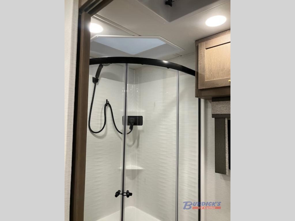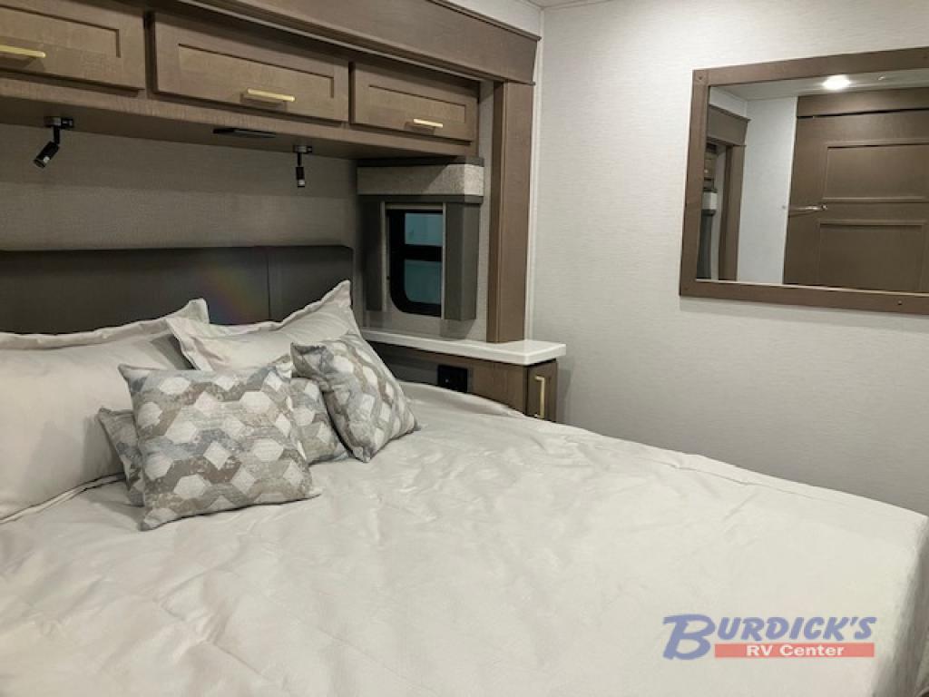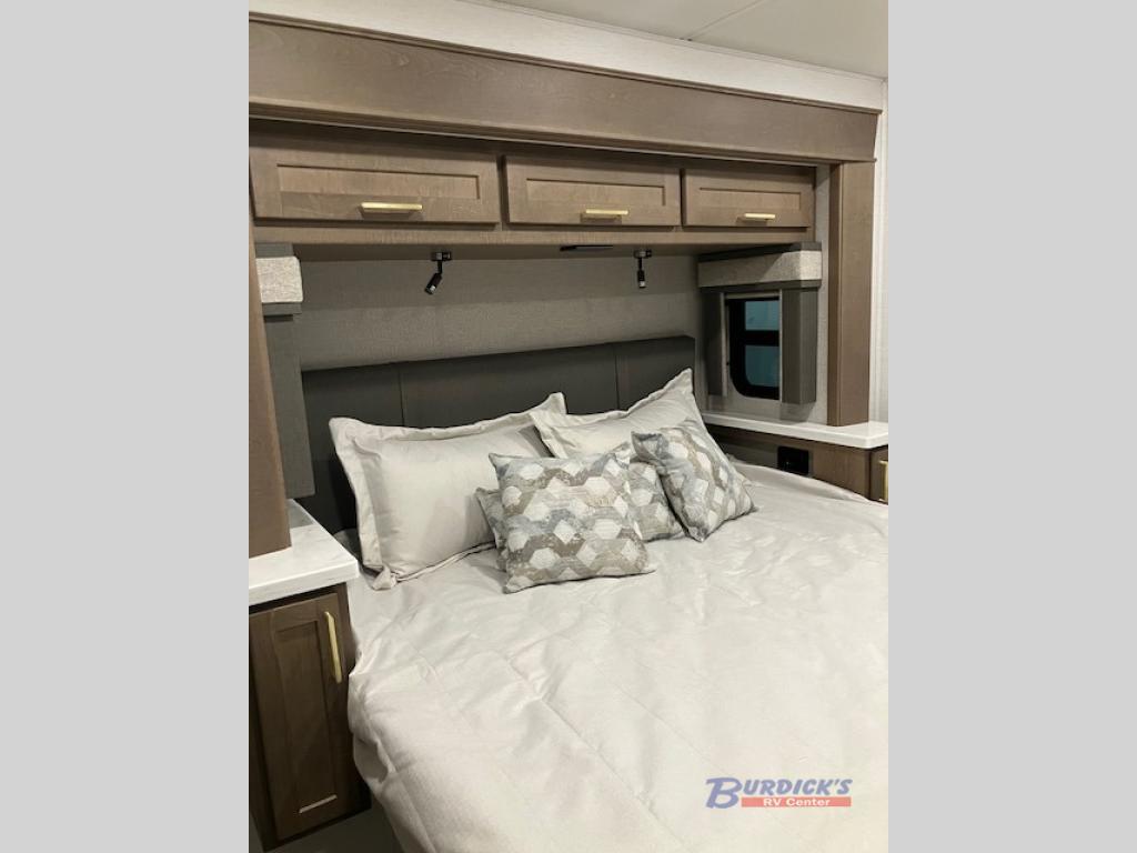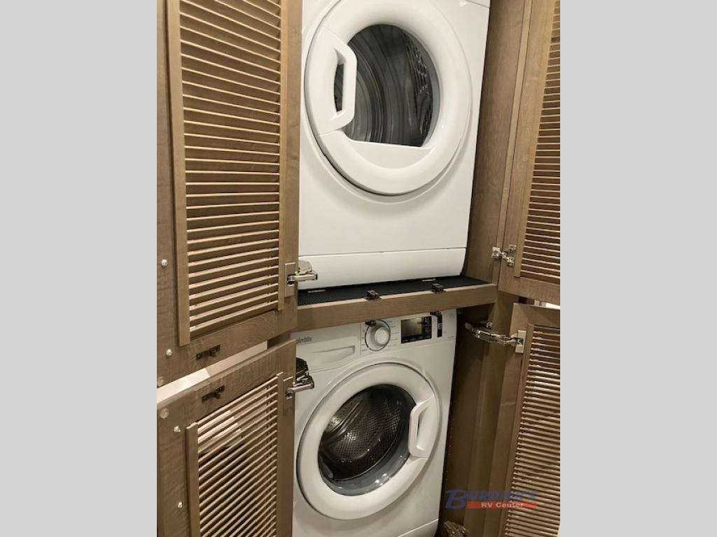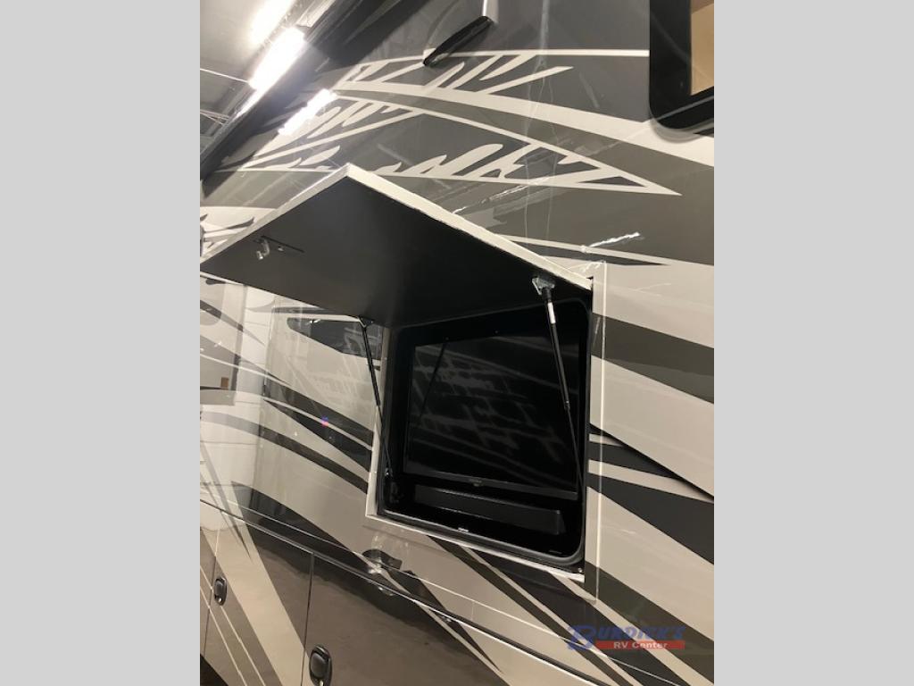 You will experience comfort and luxury with this motorhome! The rear private bedroom has a 66" x 74" mini-king bed across from a 32" Smart LED TV with a dresser below and closets on either side, plus it leads into the separated bathroom. The bathroom has a radius shower with a skylight above for natural lighting as you get ready and a closet that pre-wired and plumbed for an optional washer and dryer for clean clothes throughout your entire trip. The sofa sleeper and booth dinette offer a comfortable place to relax and convert to sleeping space. Grab a cold beverage from the 18 cu. ft. residential stainless steel refrigerator then head to the exterior entertainment center to watch the big game on the 32" Smart LED TV with a sound bar on a swivel and USB charging!