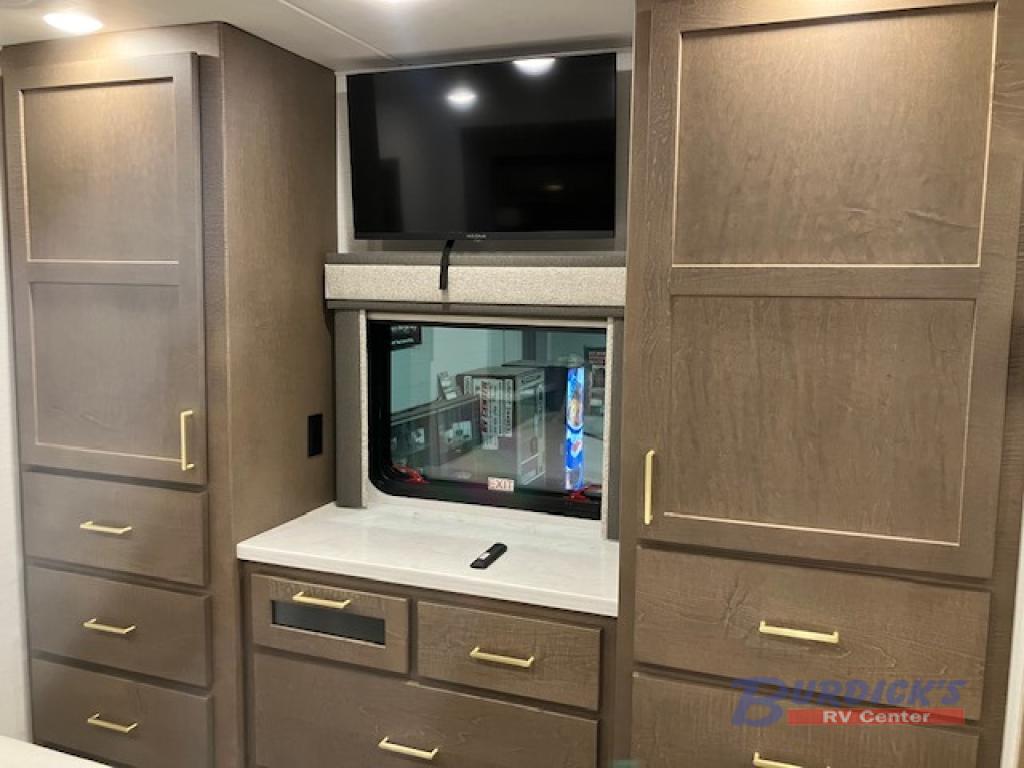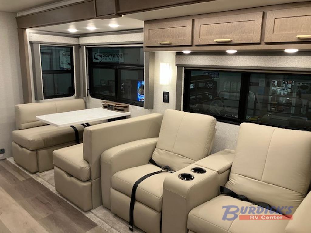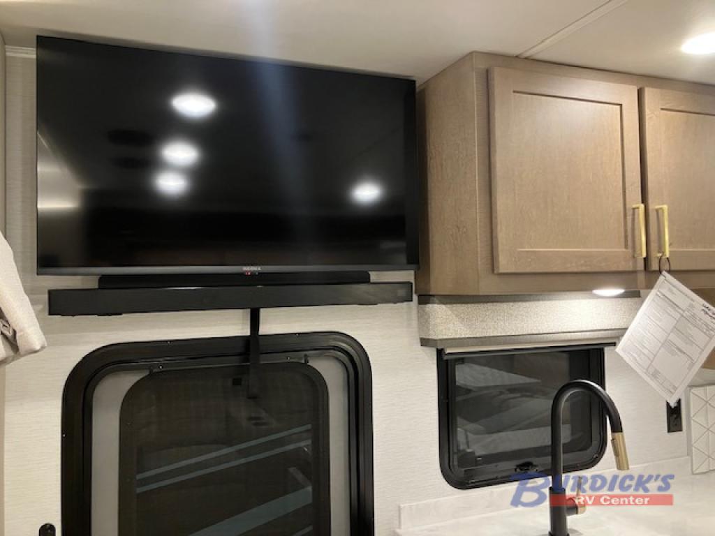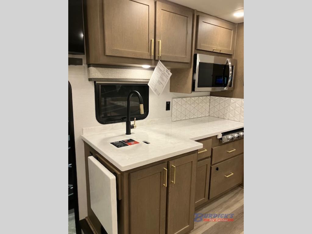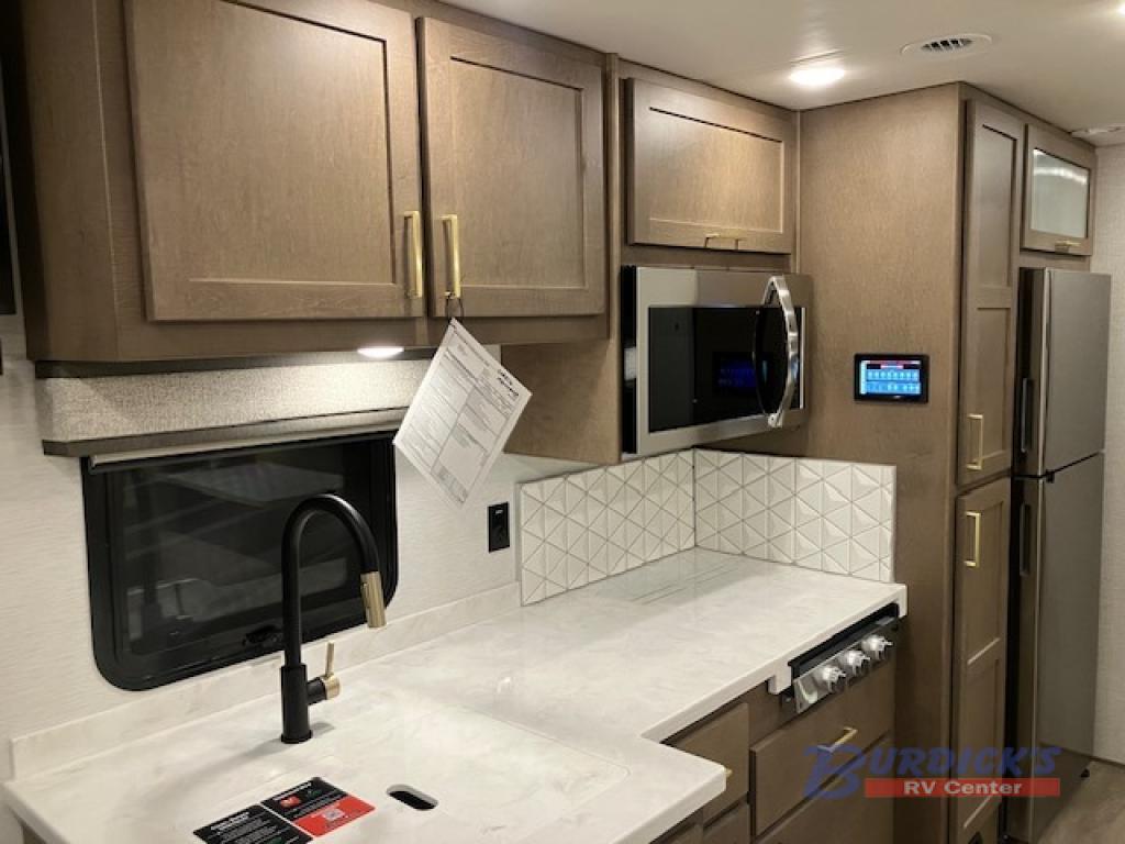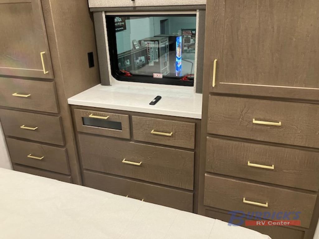 You will experience comfort and luxury with this motorhome! The rear private bedroom has a 66" x 74" mini-king bed across from a 32" Smart LED TV with a dresser below and closets on either side, plus it leads into the separated bathroom. The bathroom has a radius shower with a skylight above for natural lighting as you get ready and a closet that pre-wired and plumbed for an optional washer and dryer for clean clothes throughout your entire trip. The sofa sleeper and booth dinette offer a comfortable place to relax and convert to sleeping space. Grab a cold beverage from the 18 cu. ft. residential stainless steel refrigerator then head to the exterior entertainment center to watch the big game on the 32" Smart LED TV with a sound bar on a swivel and USB charging!