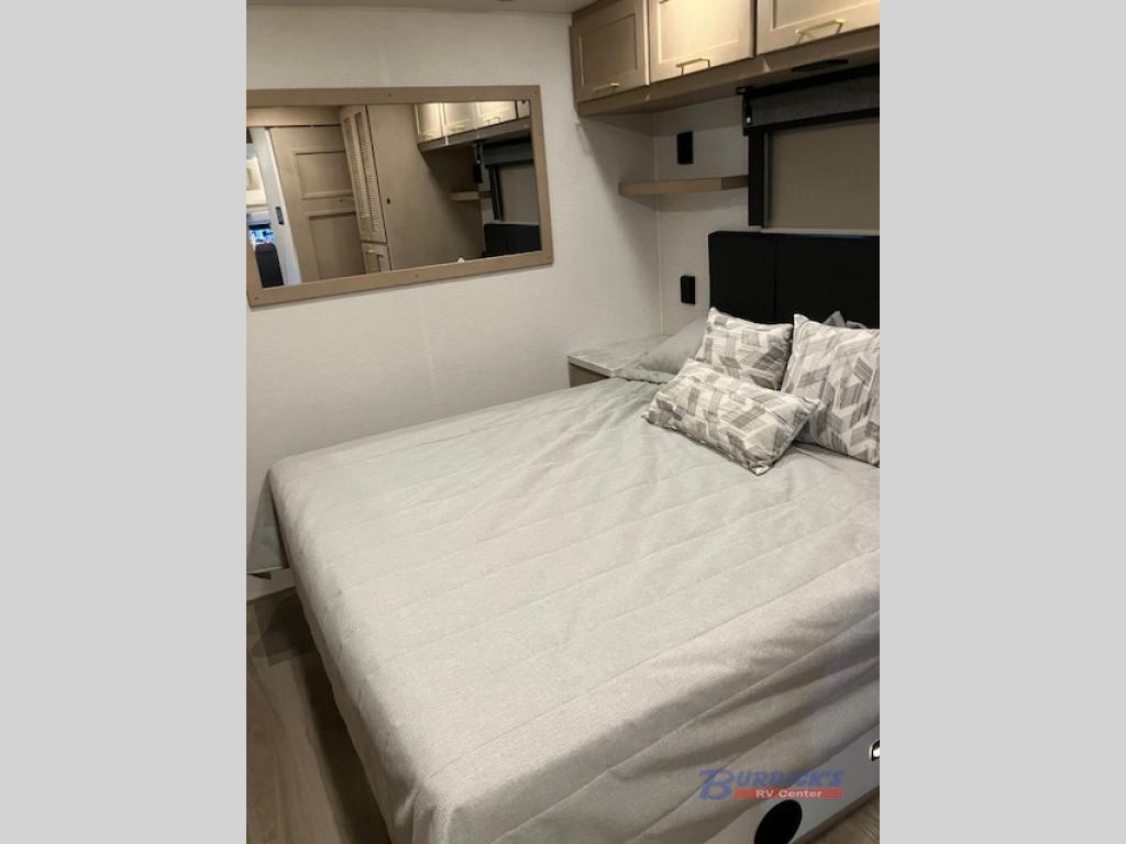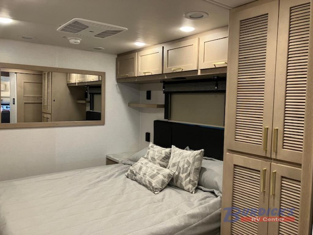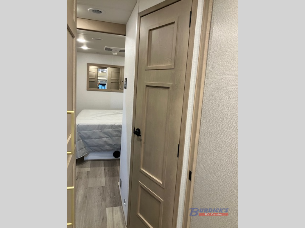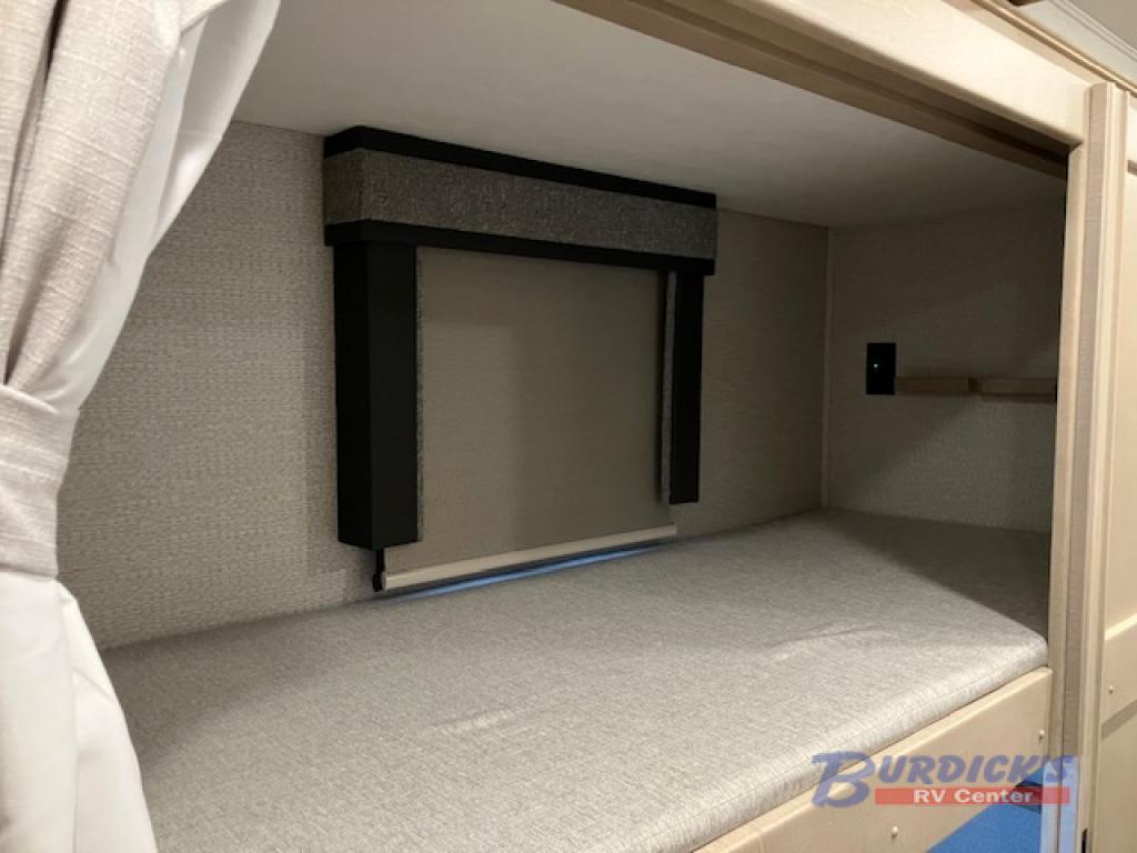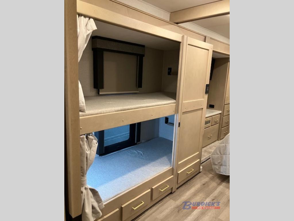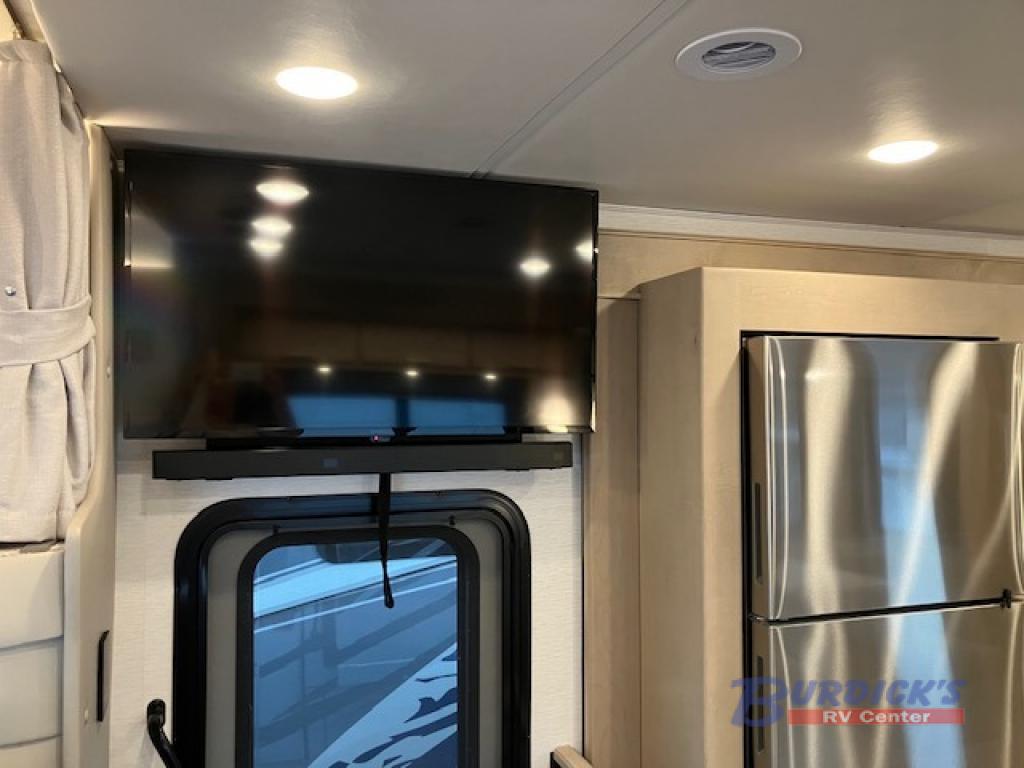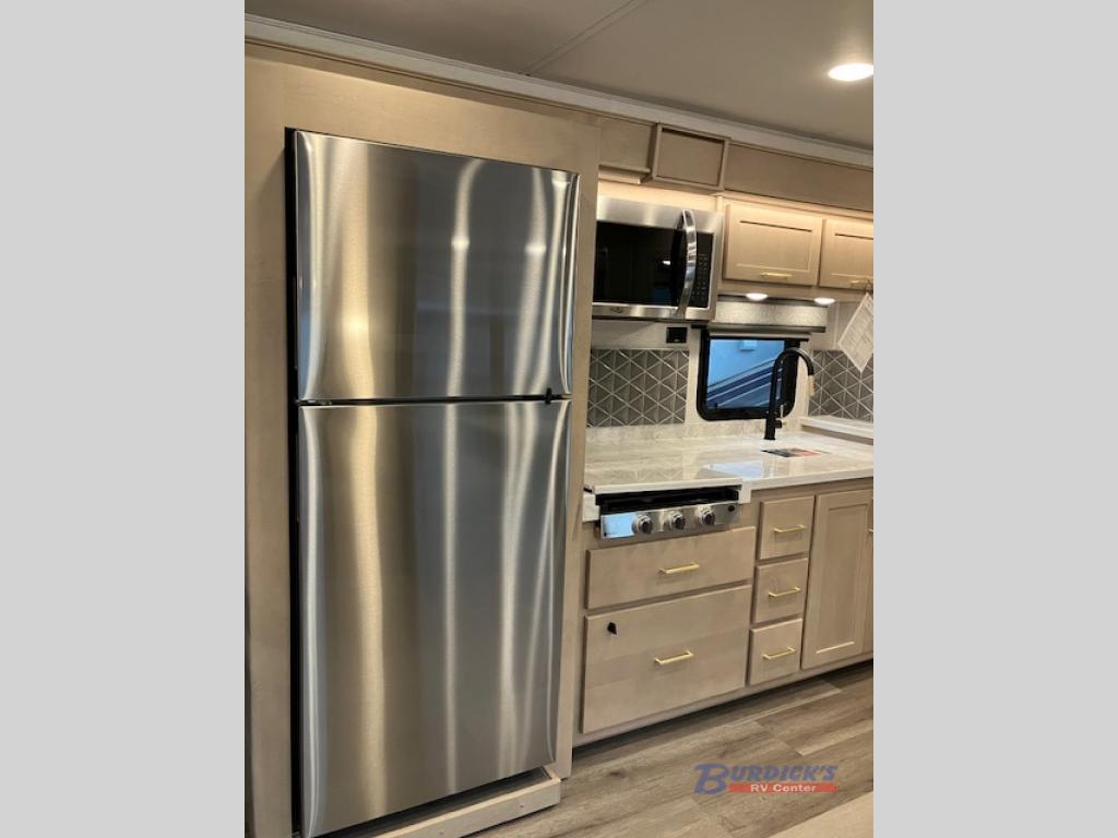 Pack your bags and load up this motorhome for a luxurious road trip! The rear private bedroom has a 66" x 74" mini-king bed to lay your head on at night, a dresser base with a 32" Smart LED TV above it, and closets on either side of it. Your kiddos or guests can sleep on the set of 30" x 76" bunk beds and the 54" x 78" bunk over cab. Or utilize the sofa sleeper and the booth dinette which convert to even more sleeping spaces. Create your best meals with the three burner cooktop and keep your perishables fresh with the 18 cu. ft. stainless steel residential refrigerator. And you will love having a mid bath for easy use!