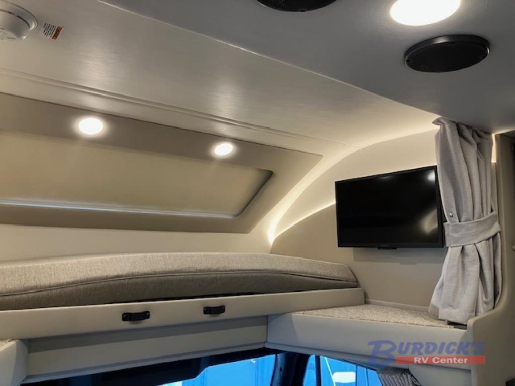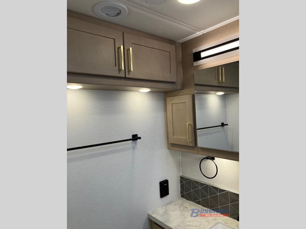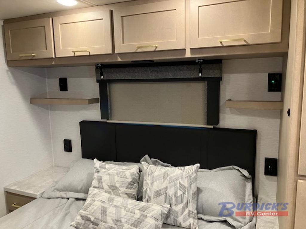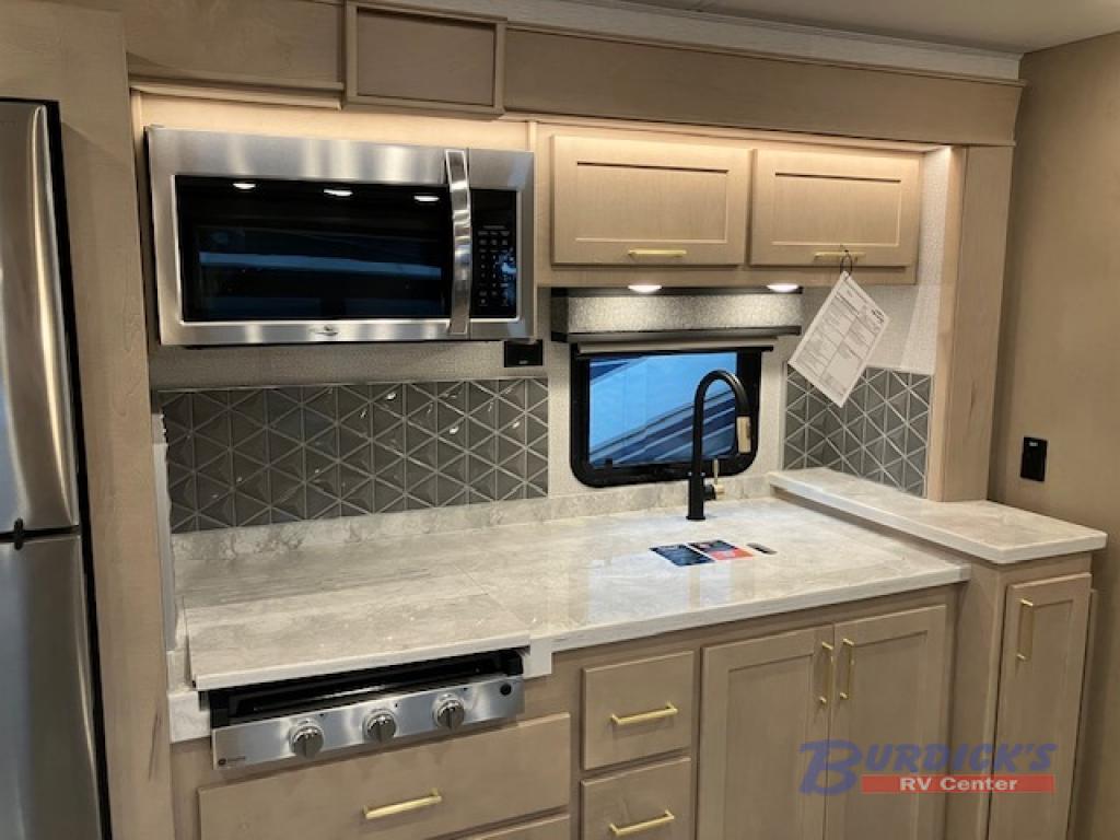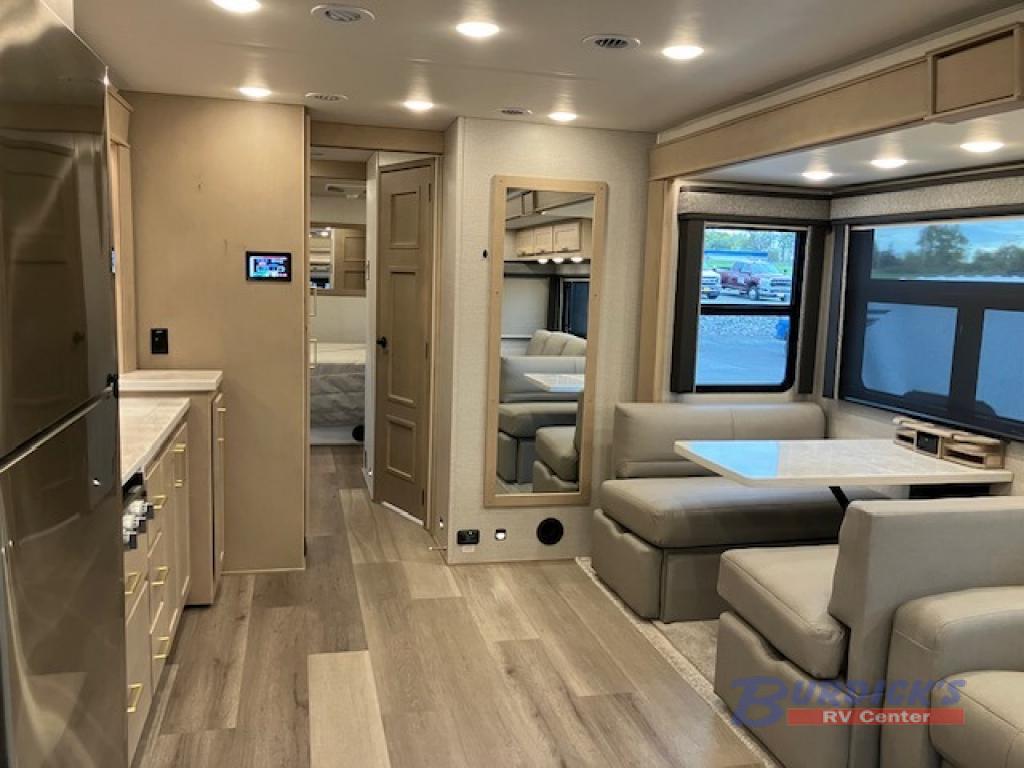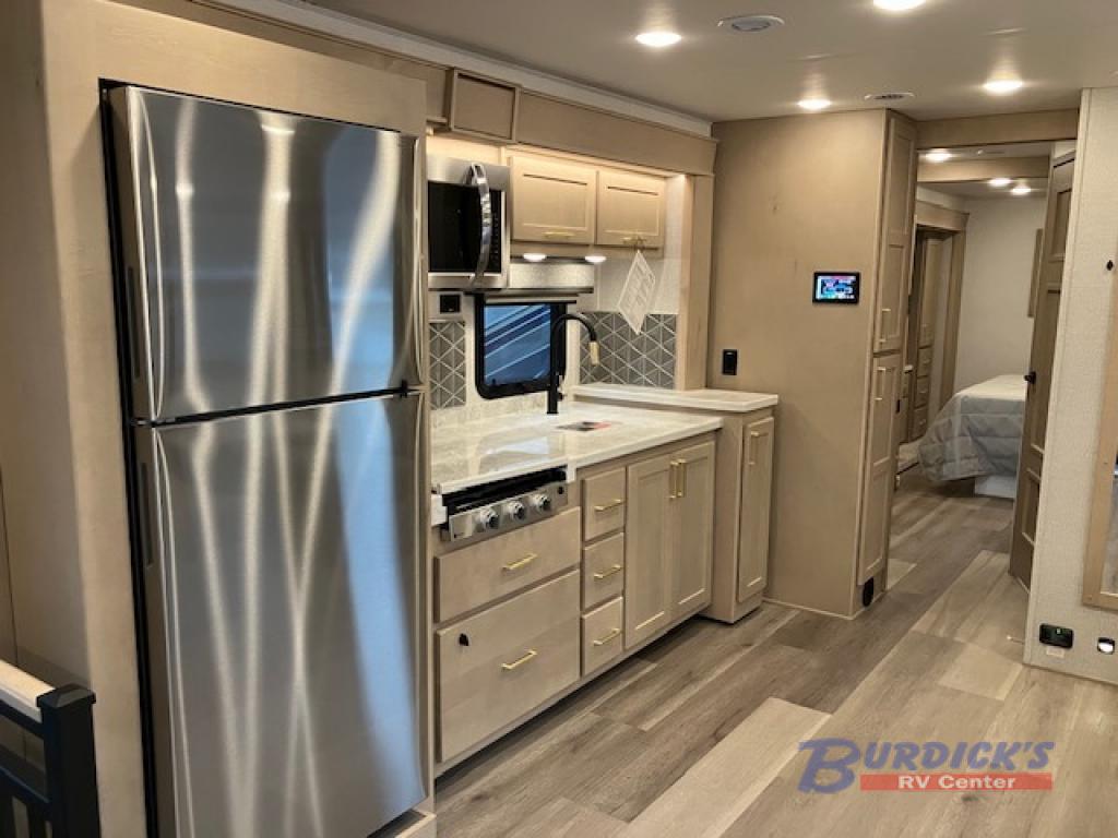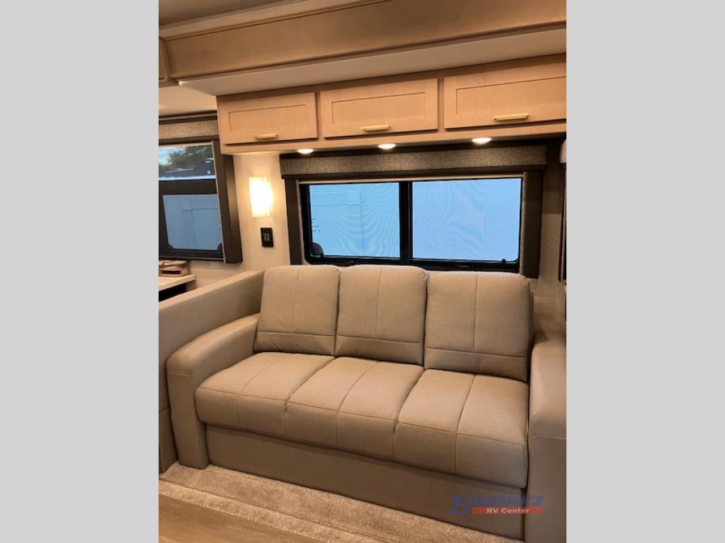 Pack your bags and load up this motorhome for a luxurious road trip! The rear private bedroom has a 66" x 74" mini-king bed to lay your head on at night, a dresser base with a 32" Smart LED TV above it, and closets on either side of it. Your kiddos or guests can sleep on the set of 30" x 76" bunk beds and the 54" x 78" bunk over cab. Or utilize the sofa sleeper and the booth dinette which convert to even more sleeping spaces. Create your best meals with the three burner cooktop and keep your perishables fresh with the 18 cu. ft. stainless steel residential refrigerator. And you will love having a mid bath for easy use!