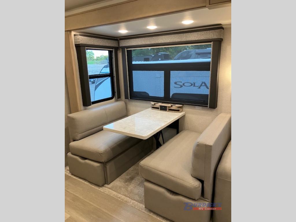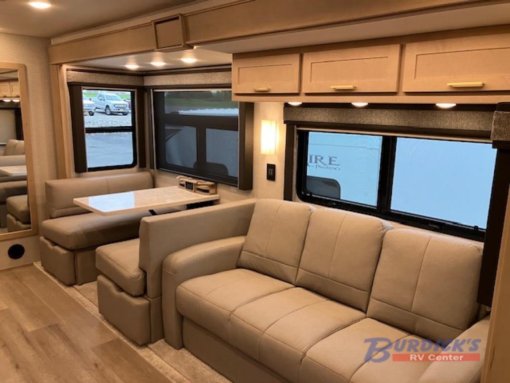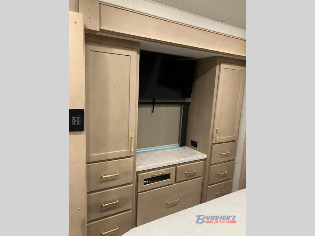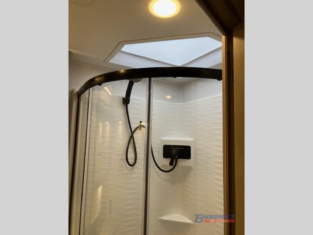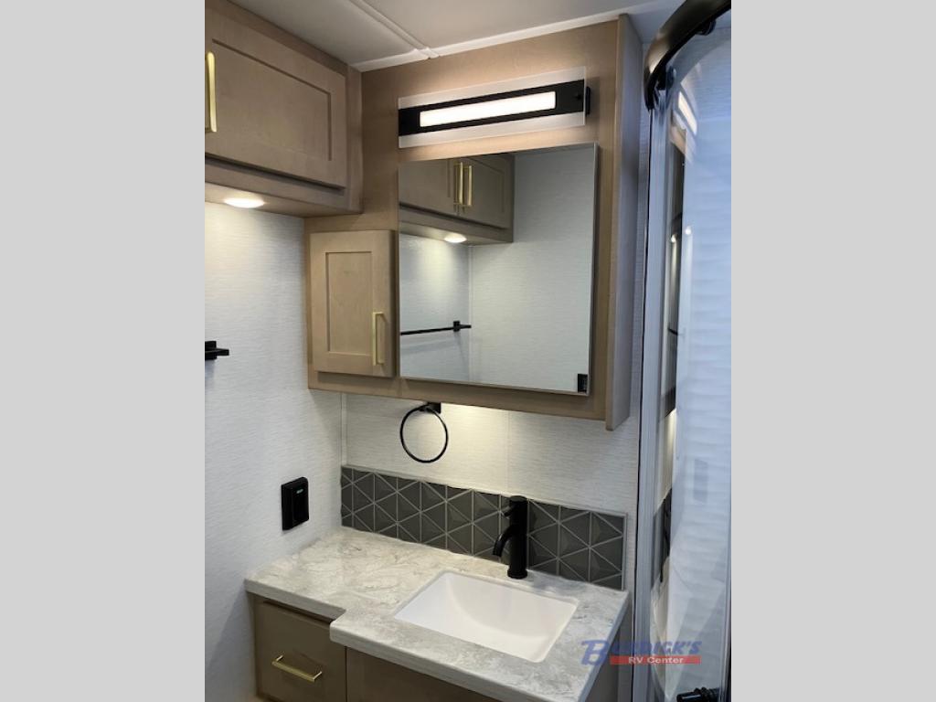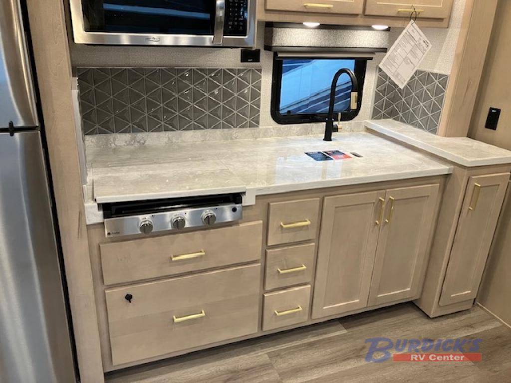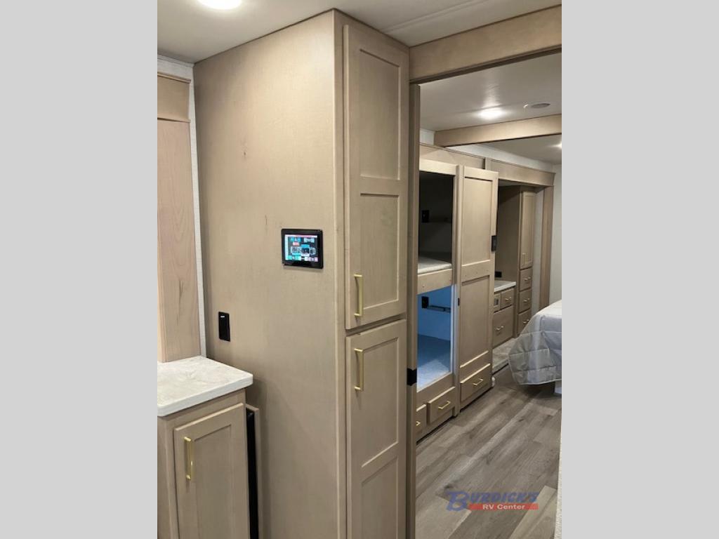 Pack your bags and load up this motorhome for a luxurious road trip! The rear private bedroom has a 66" x 74" mini-king bed to lay your head on at night, a dresser base with a 32" Smart LED TV above it, and closets on either side of it. Your kiddos or guests can sleep on the set of 30" x 76" bunk beds and the 54" x 78" bunk over cab. Or utilize the sofa sleeper and the booth dinette which convert to even more sleeping spaces. Create your best meals with the three burner cooktop and keep your perishables fresh with the 18 cu. ft. stainless steel residential refrigerator. And you will love having a mid bath for easy use!