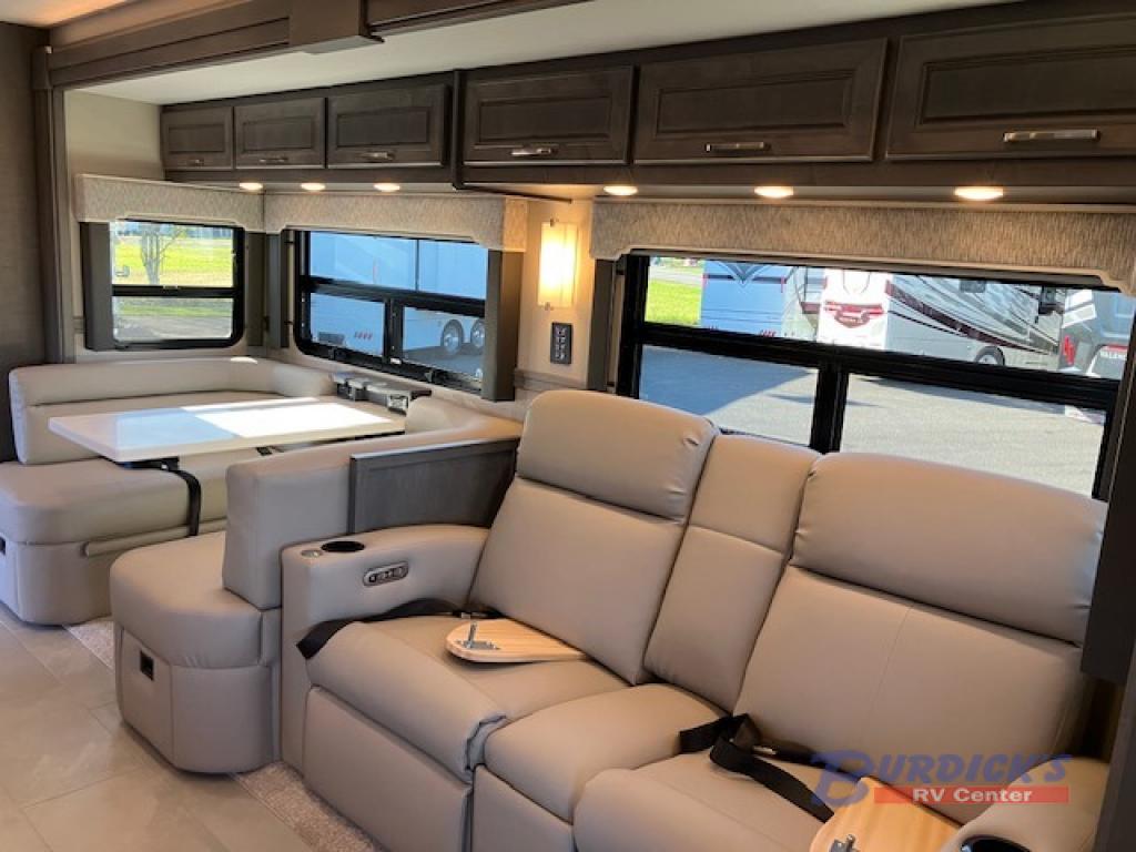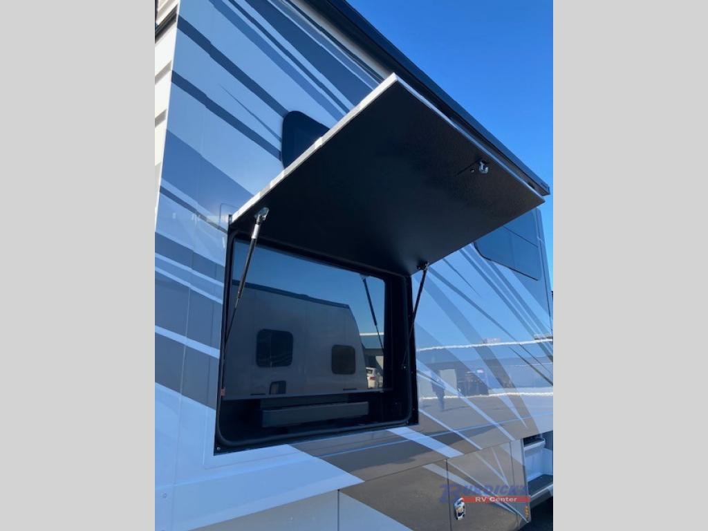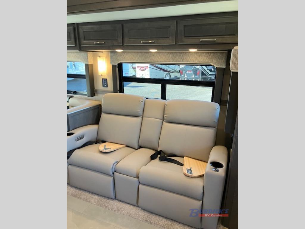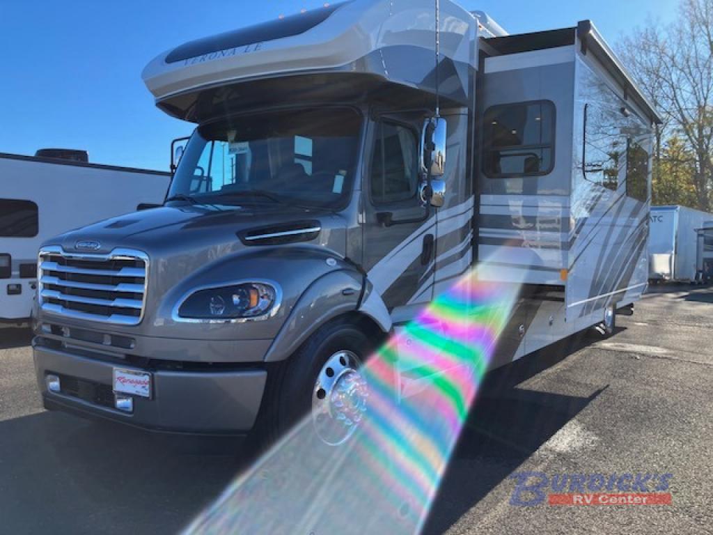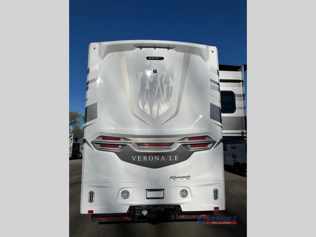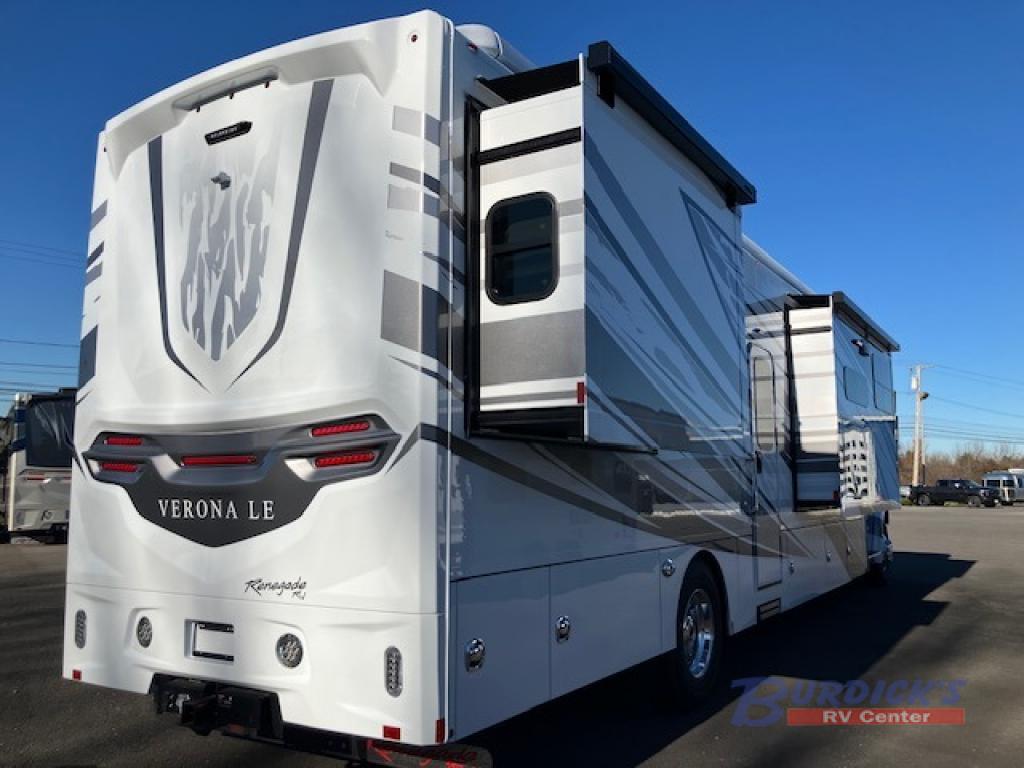 With any Verona LE Super C diesel motorhome by Renegade, you will be wowed by all the luxury features. The 2" vacuum laminated sidewalls feature welded aluminum framing for added support, and the 1.5" high density foam insulation in the sidewalls and roof means you can travel all year long in any season. The captain will love how easy it will be to drive with the Allison 3200TRV electronic 6-speed transmission, plus there are rear and side view cameras for easy parking and an upgraded cab sound system to keep the tunes going. Each model includes dual 15,000 BTU roof A/C pumps, an Aqua-Hot 450D hydronic water and zone heating system, plus MaxxAir power vents to keep you comfortable all year long. All of your power needs will be met with an 8kW Onan Quiet diesel generator, 3,000w True Sine wave inverter, (2) 330Ah AGM house batteries, and (3) 200W solar panels. Inside, there are three modern decor options to choose from, along with solid surface countertops, grouted tile backsplash, Maple hardwood cabinetry, and many more comforts of home!