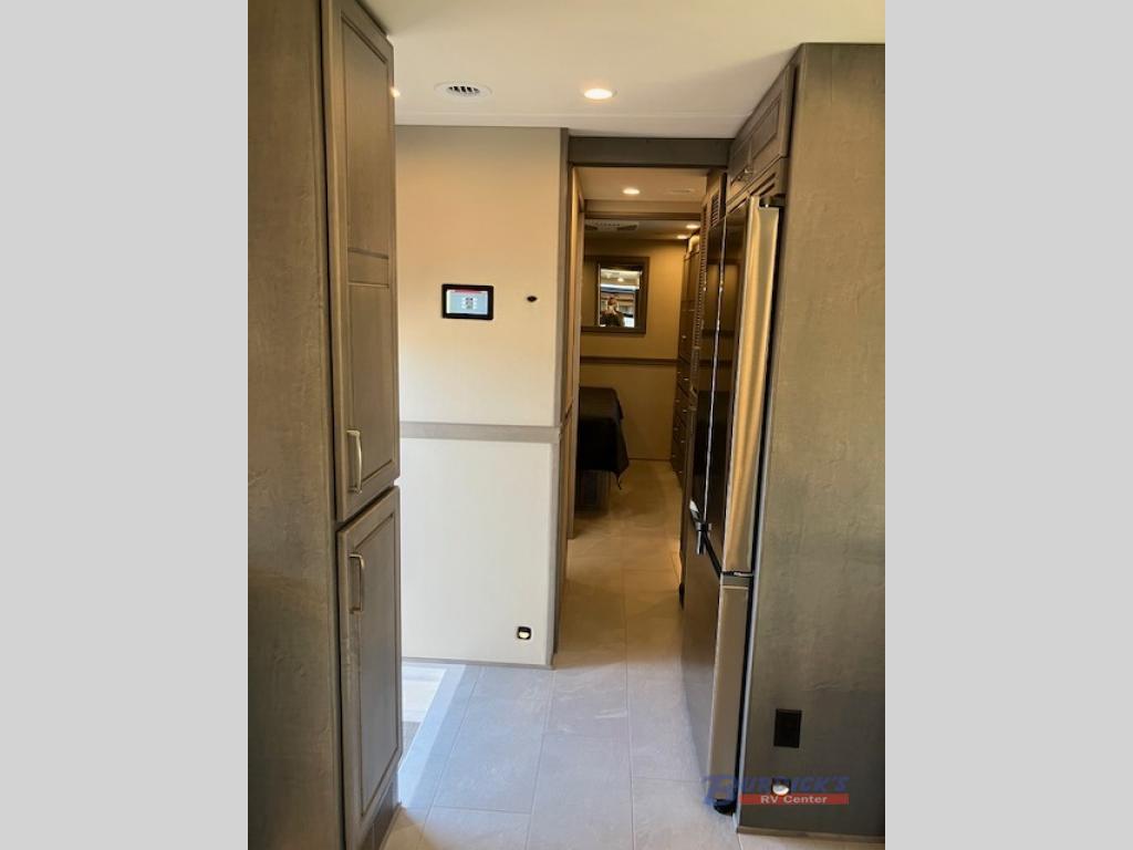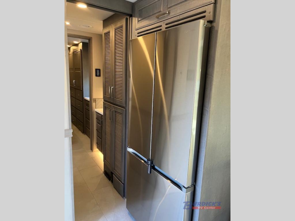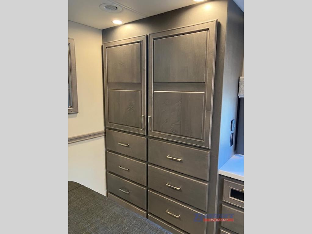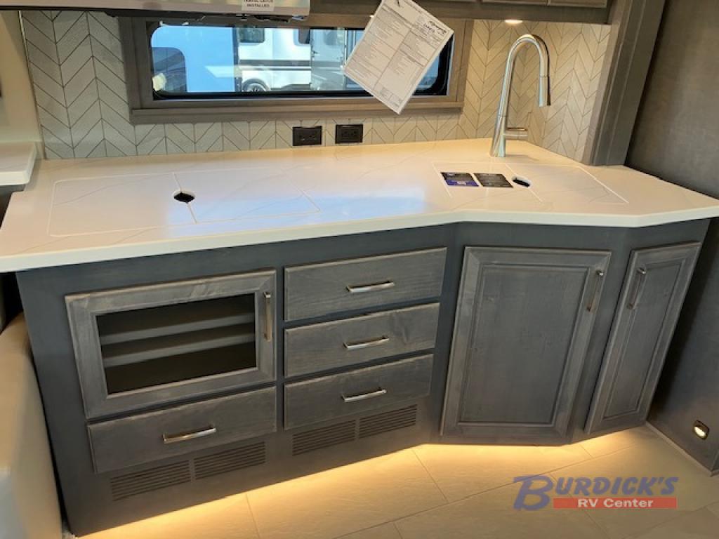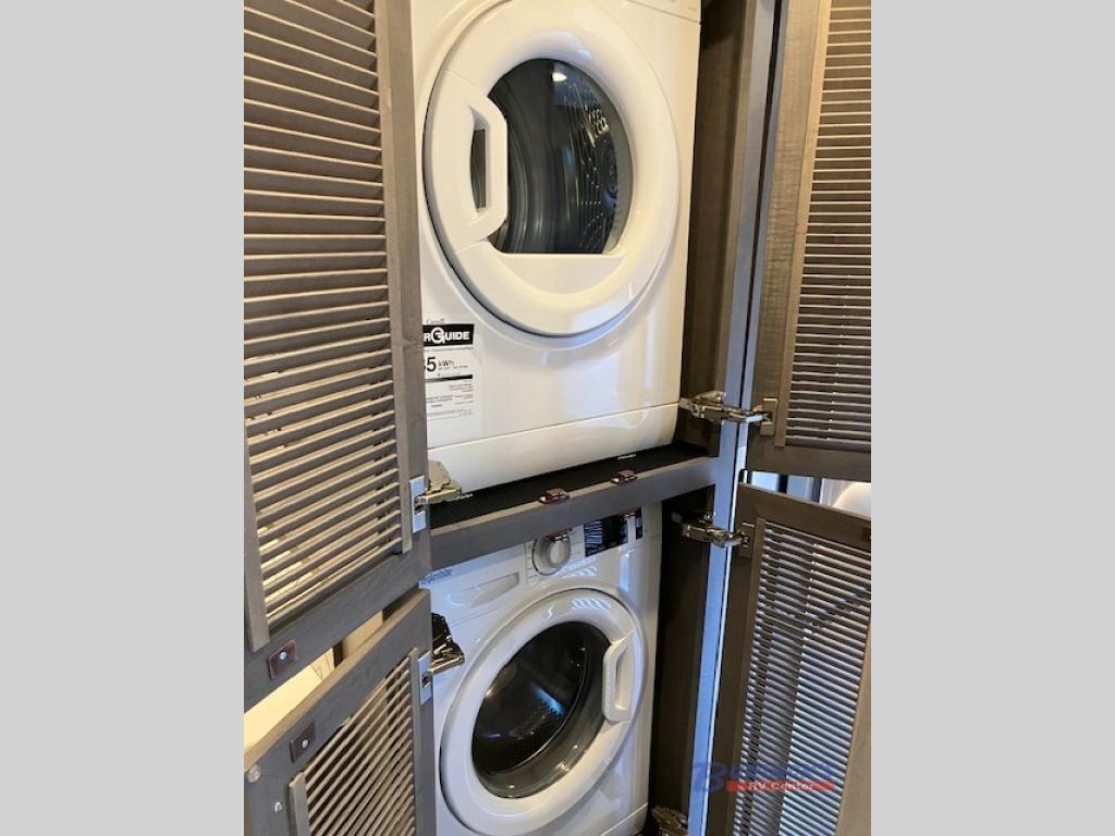 This family-friendly coach offers sleeping space for six when you convert the hide-a-bed sofa, the second sofa and the booth dinette. The triple slides open up the living area and bedroom giving everyone lots of floor space to move about during the day and at night. The rear bedroom offers a memory foam mattress, a wardrobe and a 32" Smart LED TV. You will surely appreciate the split-style bathroom when trying to quickly get ready to shop in town or prepare for bed. You can make meals for everyone using the recessed two burner induction cooktop and convection microwave, and will also appreciate 18 cu. ft. French door residential refrigerator with stainless steel doors.
