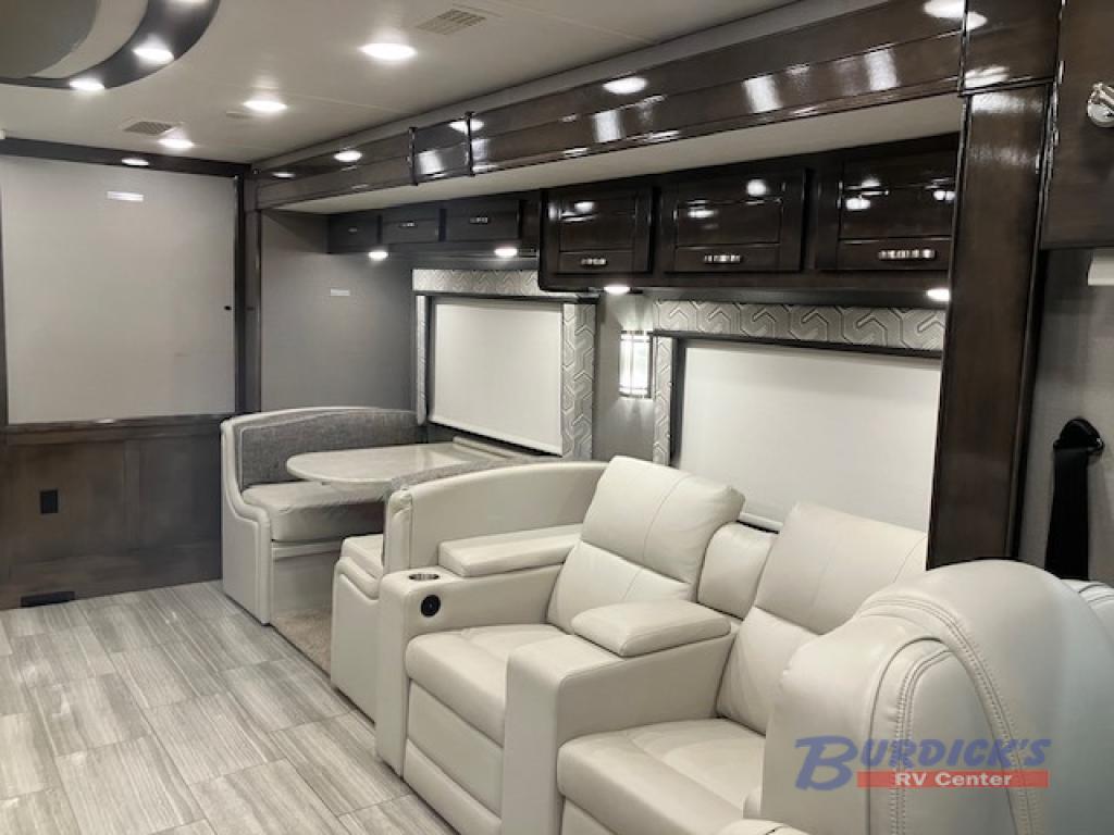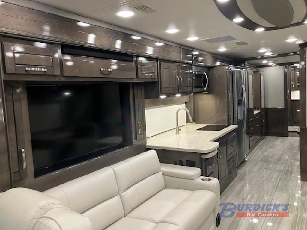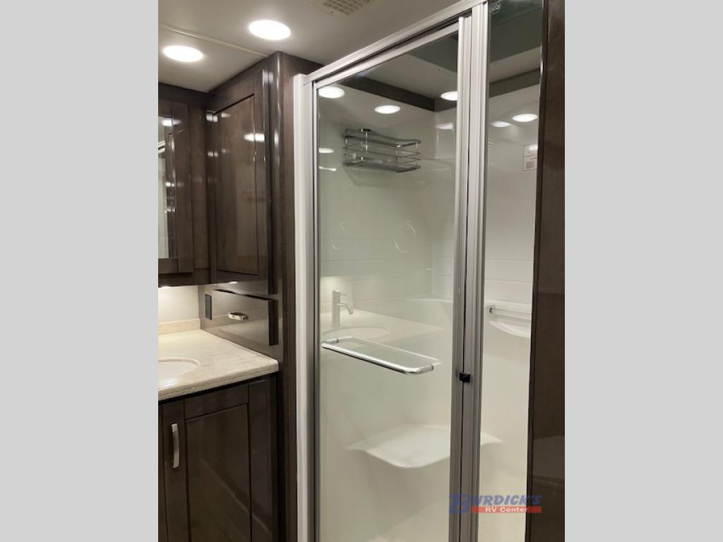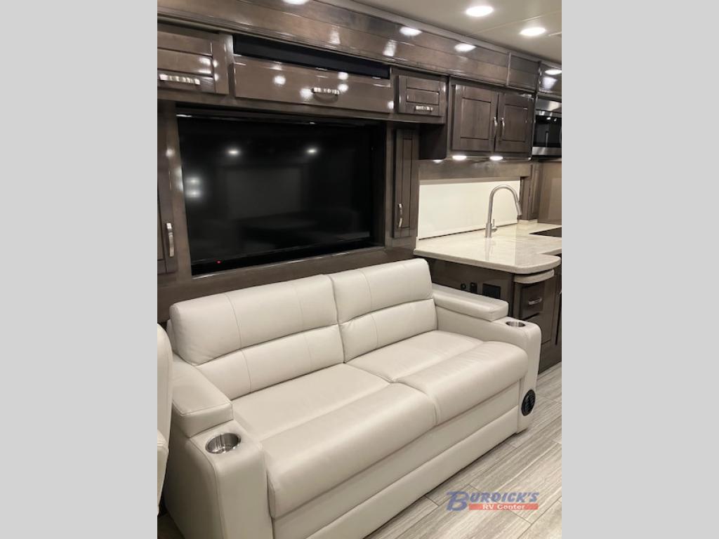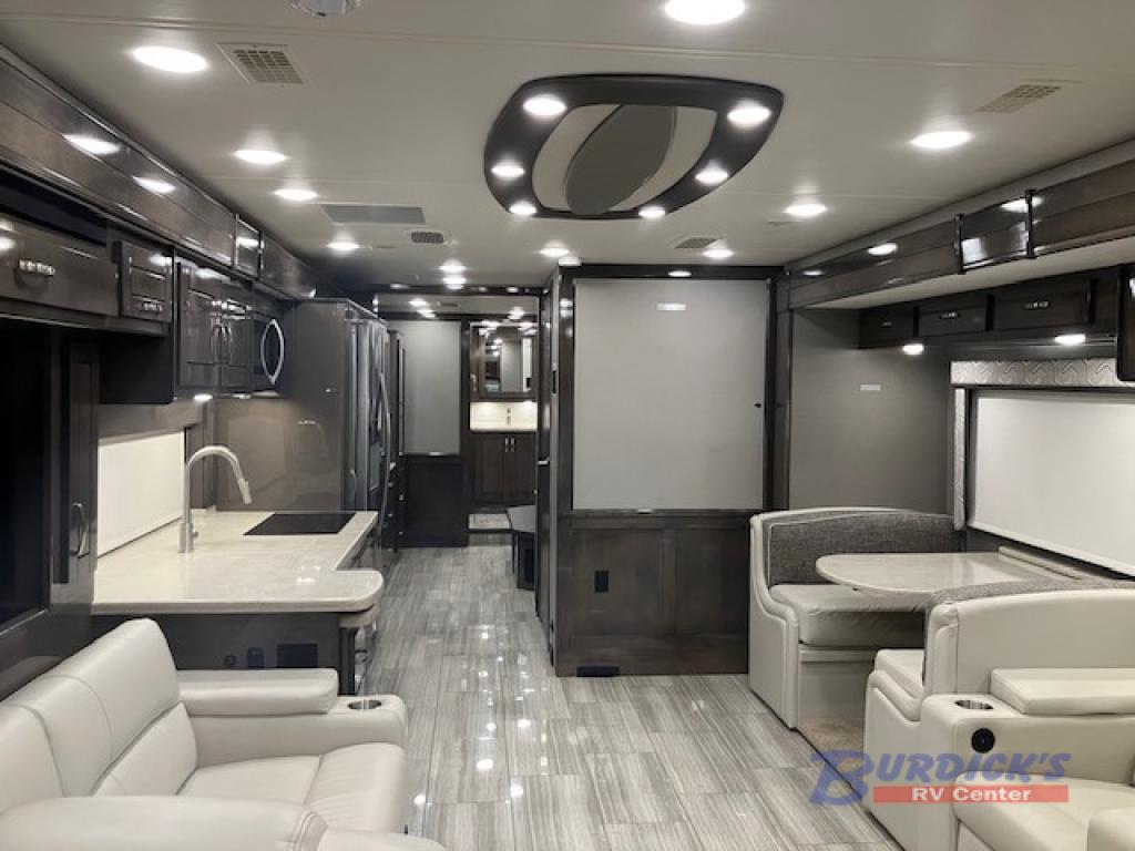 If you are looking for a new line of luxury, you will find it in this Embark Class A diesel motorhome. This indulgent unit has the ability to sleep seven people, and with its full and half bathroom, you will never again have to fight about the time it takes to get ready in the morning. Whether you are enjoying a movie night together on the 50" LED TV in the living area, or relaxing in your private master suite on the king-size bed with a power head lift in front of the 32" LED TV, you will certainly be enjoying yourself in this motorhome.