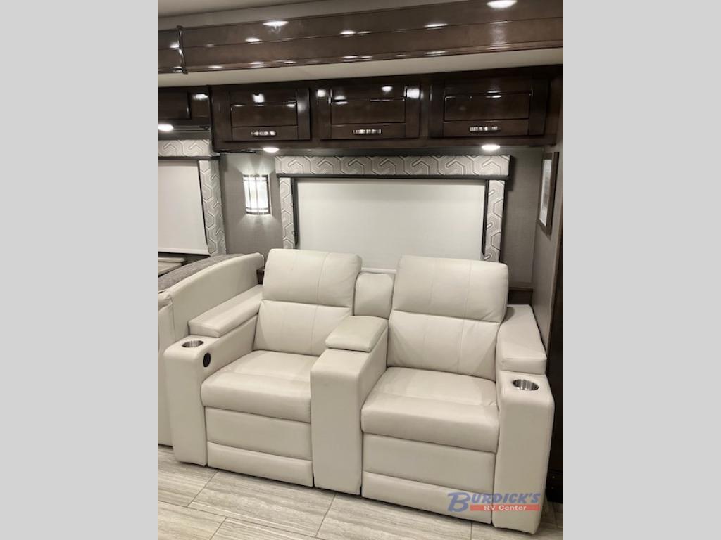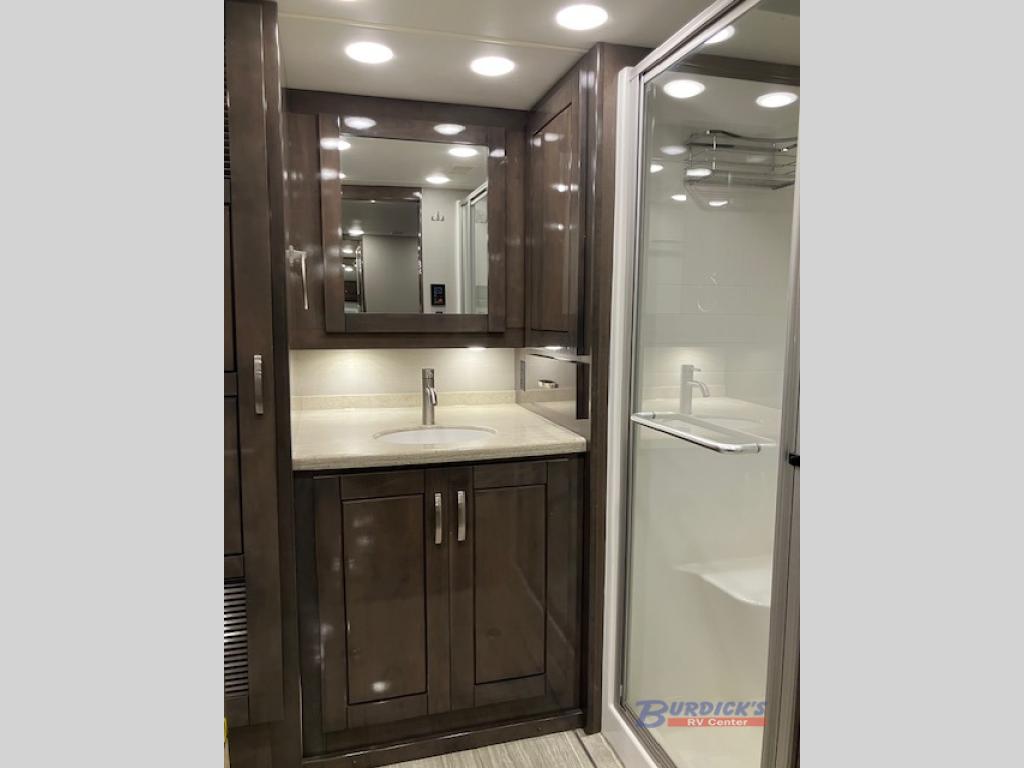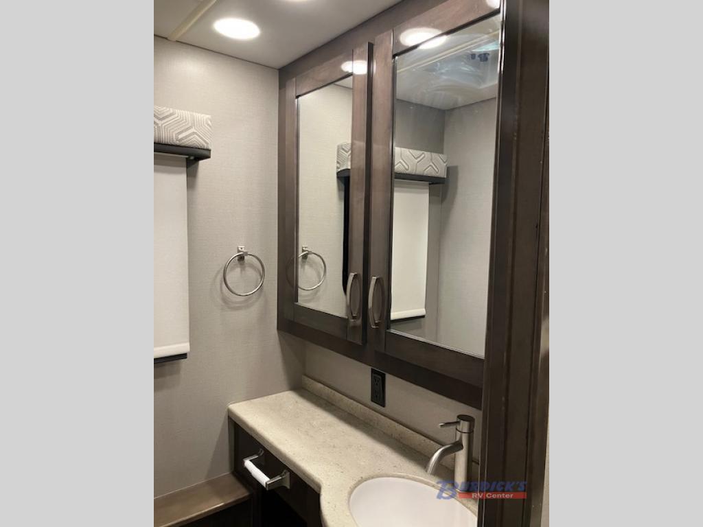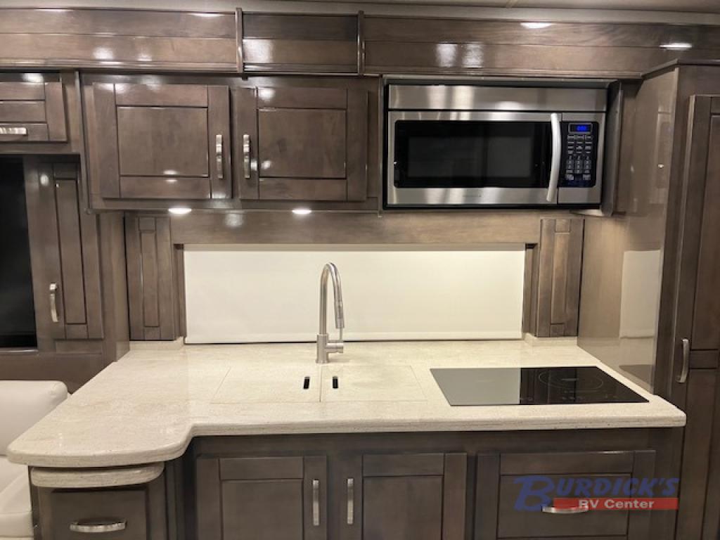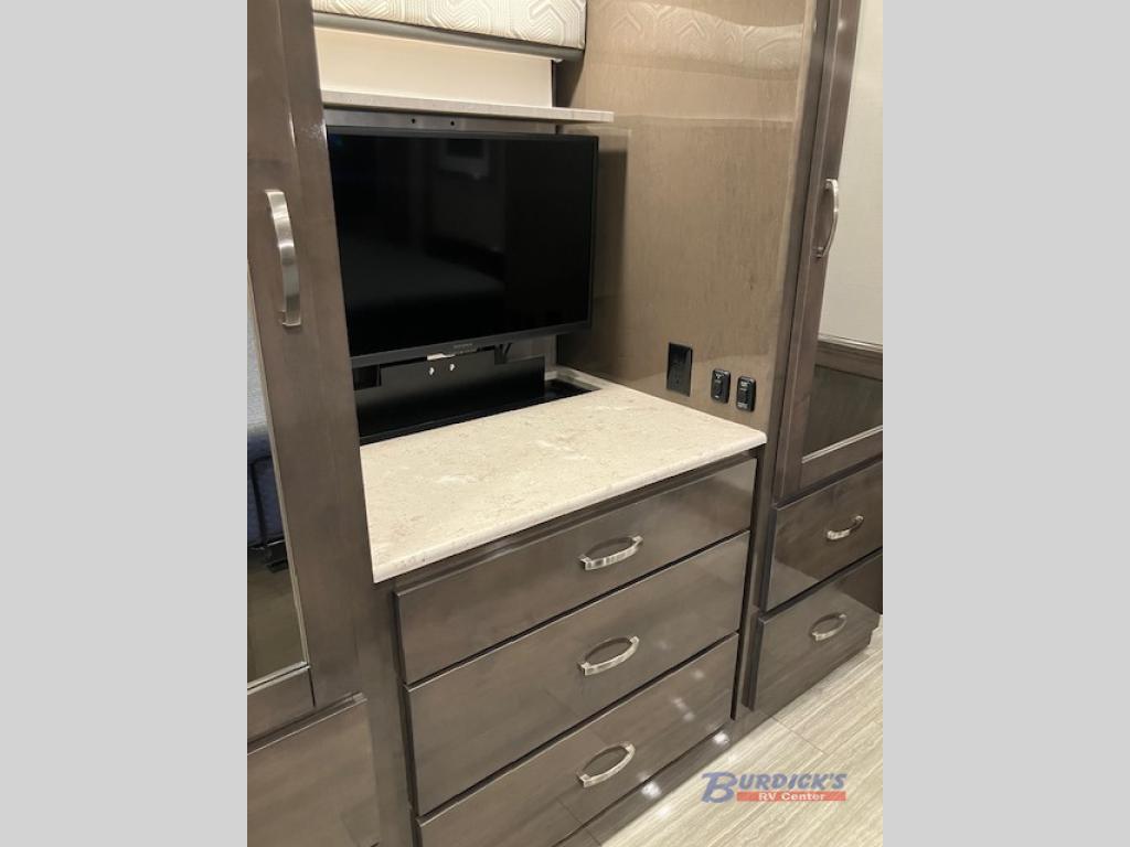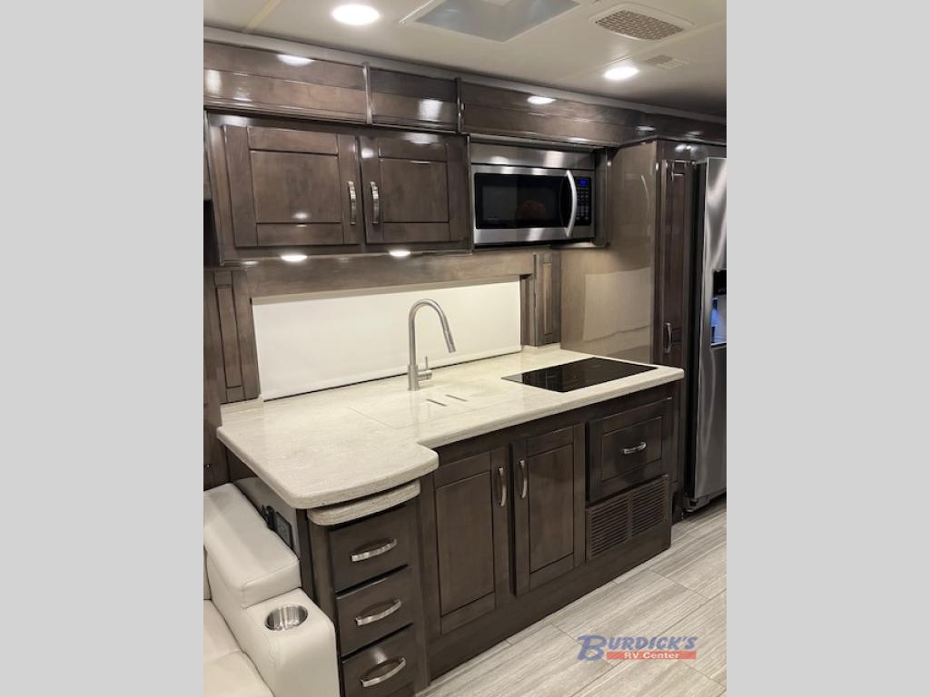 If you are looking for a new line of luxury, you will find it in this Embark Class A diesel motorhome. This indulgent unit has the ability to sleep seven people, and with its full and half bathroom, you will never again have to fight about the time it takes to get ready in the morning. Whether you are enjoying a movie night together on the 50" LED TV in the living area, or relaxing in your private master suite on the king-size bed with a power head lift in front of the 32" LED TV, you will certainly be enjoying yourself in this motorhome.