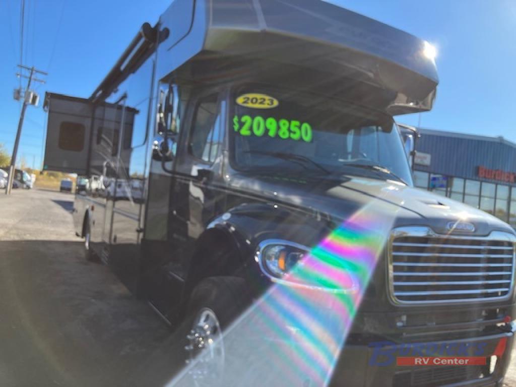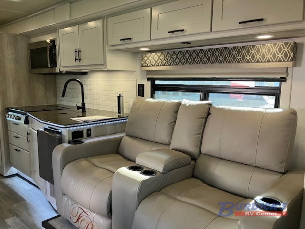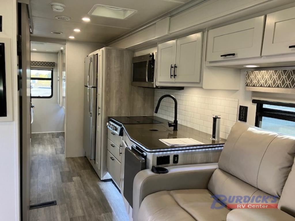 The Europa Super C diesel motorhome by Dynamax is coming to you with all the power, durability, and luxury you need for your adventurous lifestyle. You will love the solid surface countertop with LED edge lighting in the kitchen, the premium vinyl flooring throughout, and the clean, contemporary styling with a Dusk decor. The on-demand water heater is a luxury you won't want to travel without, and the Firefly multiplex wiring with a touch screen command center includes switch panels, and Bluetooth Smart Phone app control for ease of use. There is a single 12V 8D AGM deep-cycle maintenance-free house battery and two 100-watt solar panels to go off-grid if you choose, and the 12,000 lb. trailer hitch will allow you to bring along the off-road toys. Some of the exterior features that make this coach great are the dual-pitch armless patio awning with LED lighting, the automatic four-point hydraulic leveling jacks, and the eye-catching custom full-body paint package!