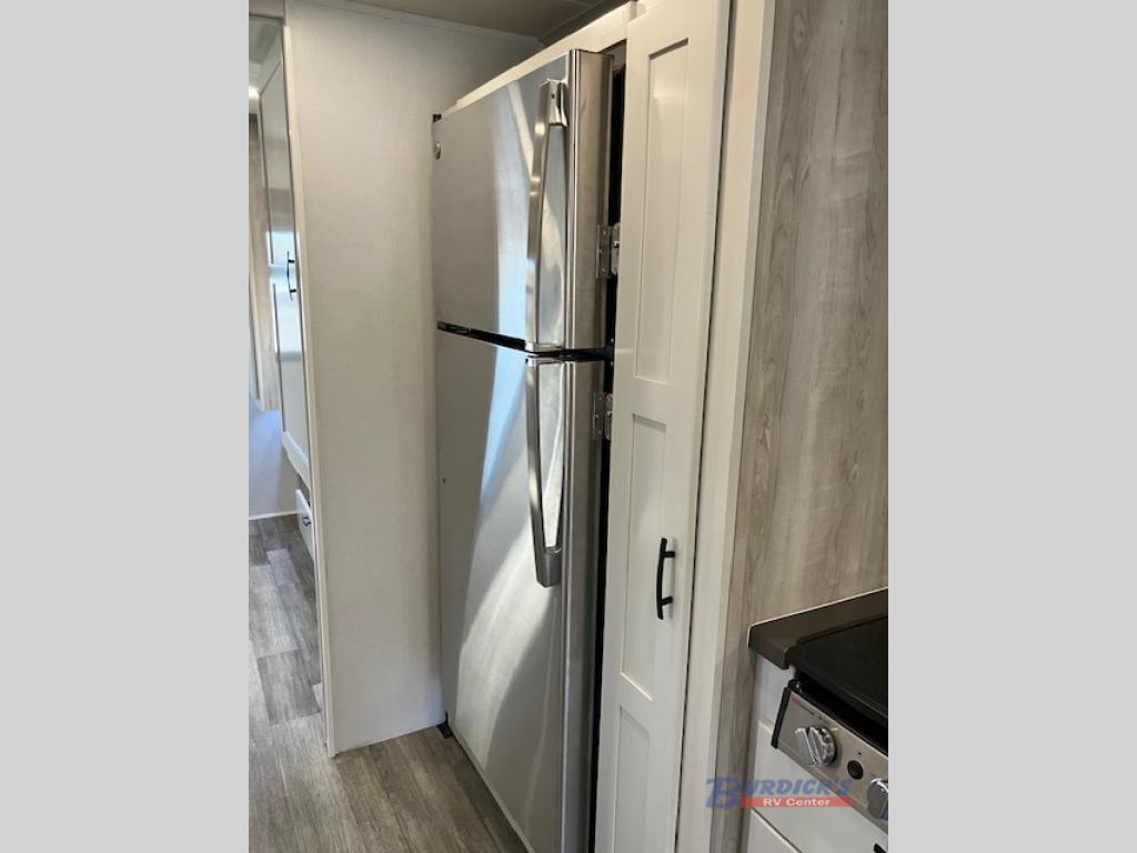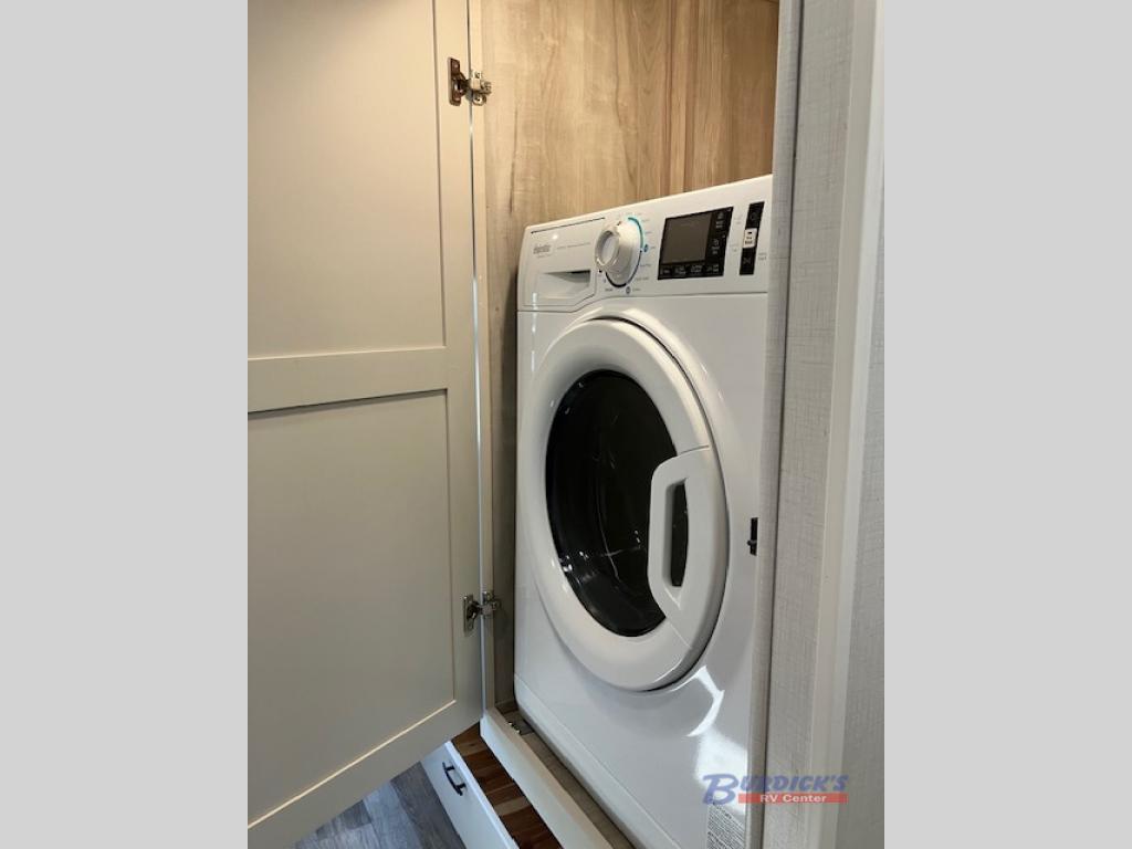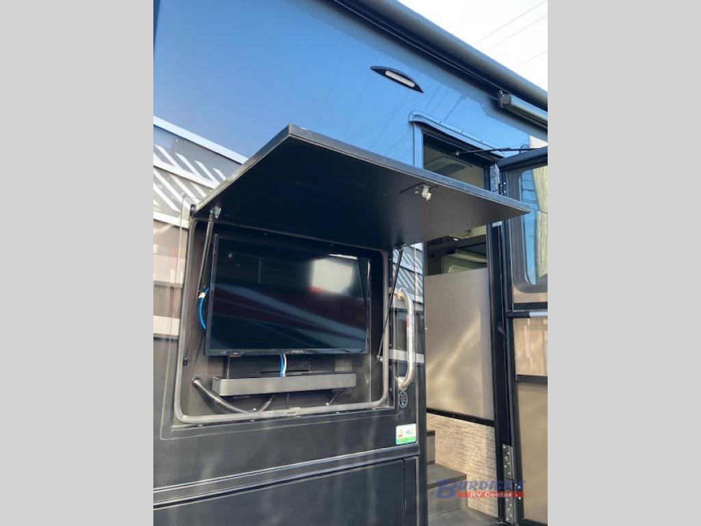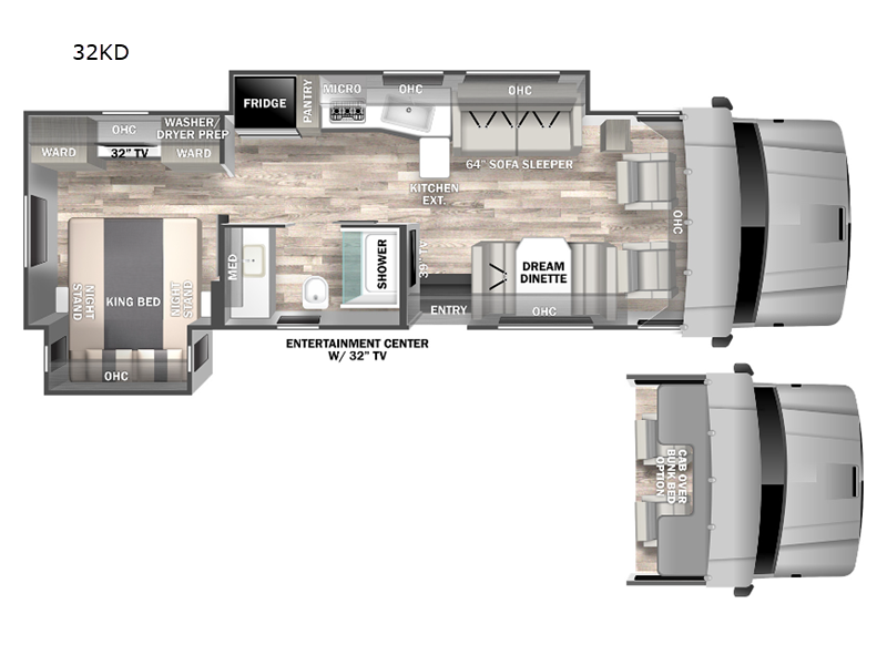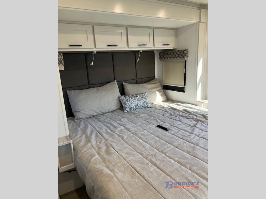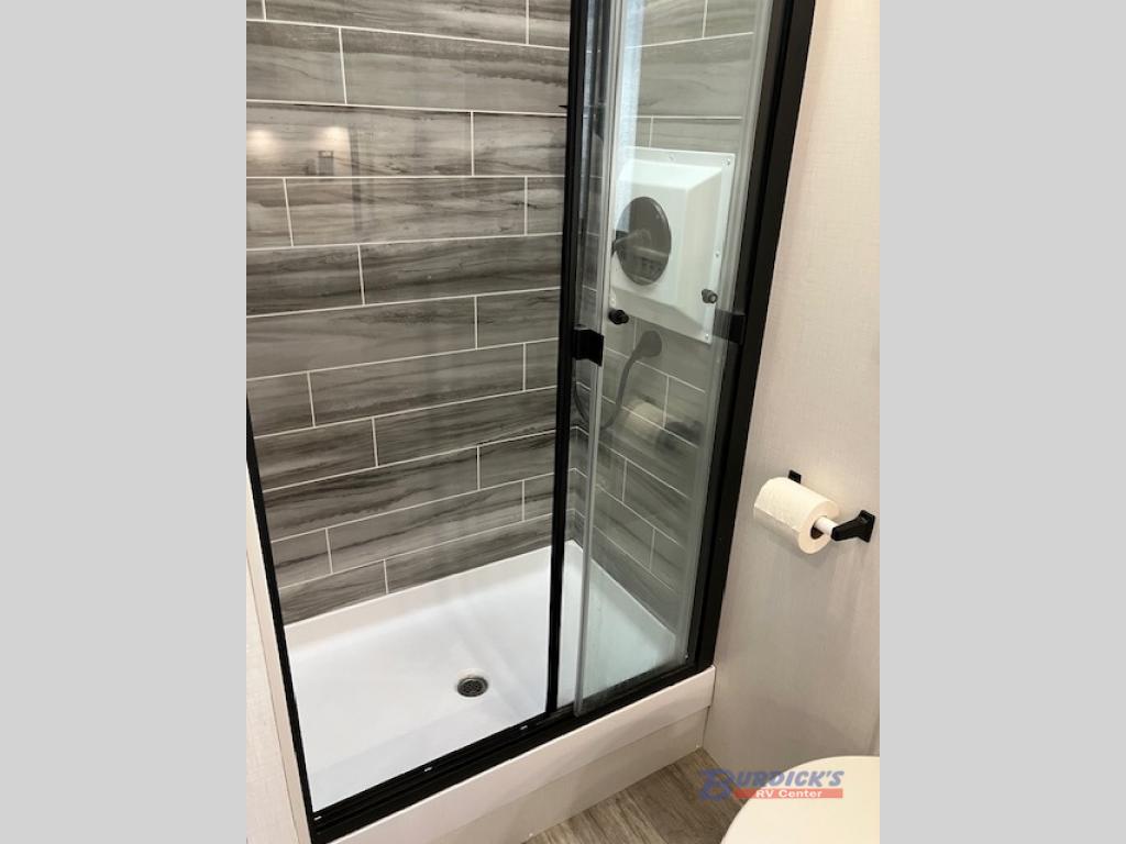 Whether you plan to go near or far, you'll stay comfortable in this spacious coach! There is a king bed slide out in the rear bedroom, plus dual wardrobes, dual nightstands, and your own 32" TV. Each morning, you can freshen up in the full bath that includes a glass shower door, then head to the kitchen for breakfast. There is a convection microwave, a gas range, plus a 16 cu. ft. residential refrigerator with an ice maker for convenience. The 64" sofa sleeper and Dream Dinette provide a place to dine, relax, and sleep additional guest, and you might want to add the cab-over bunk option for the little ones. Spend your evenings outdoors under the armless patio awning with LED lighting and watch a movie on the exterior 32" TV!
