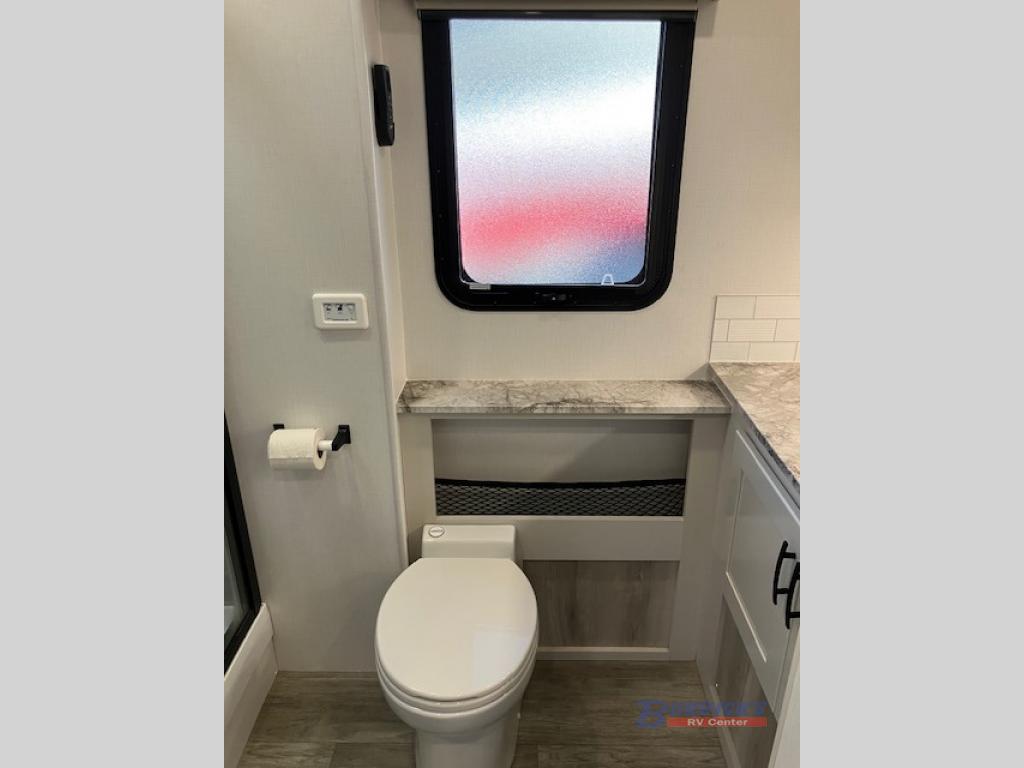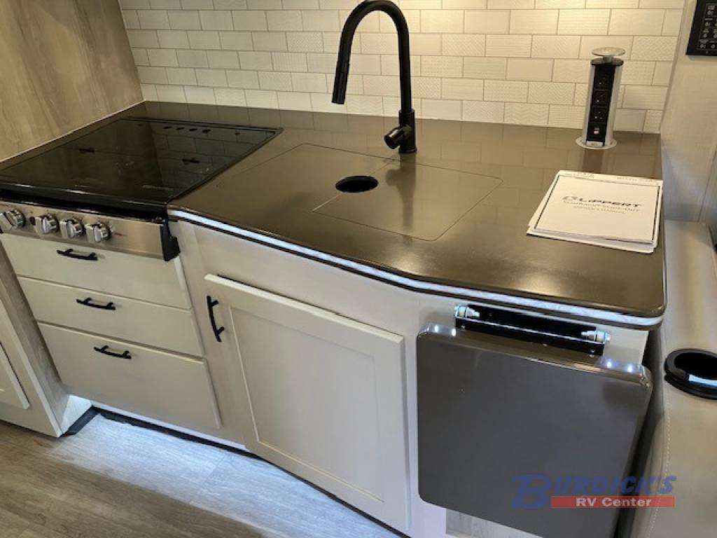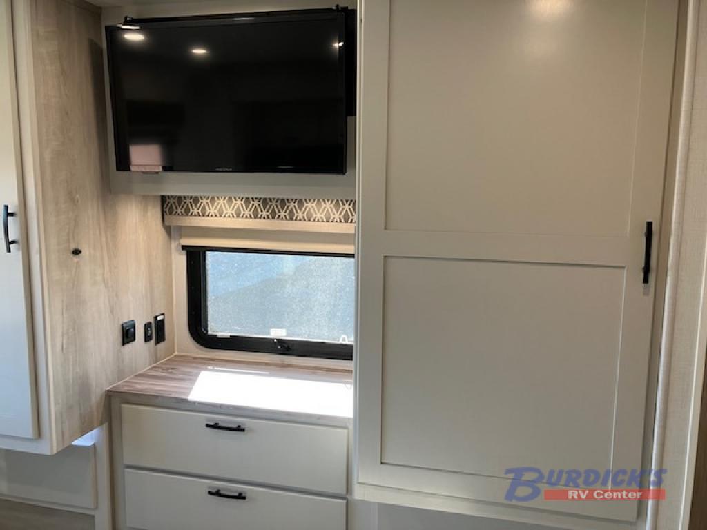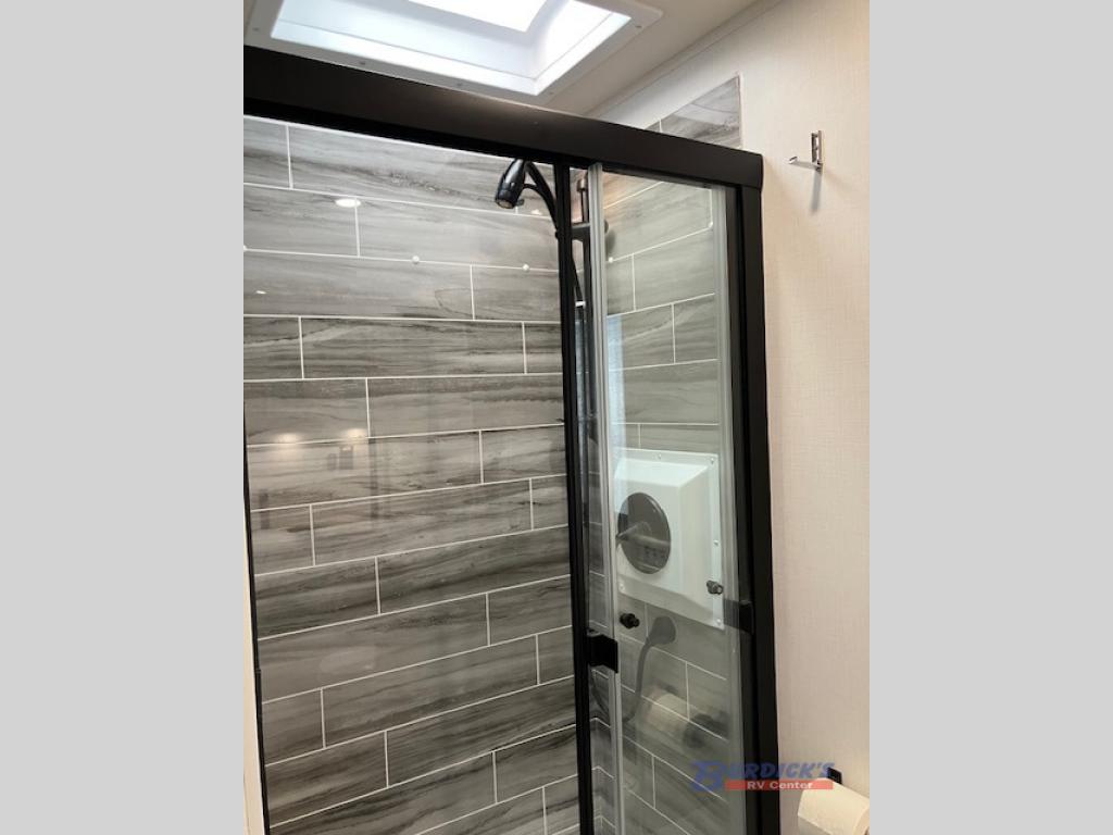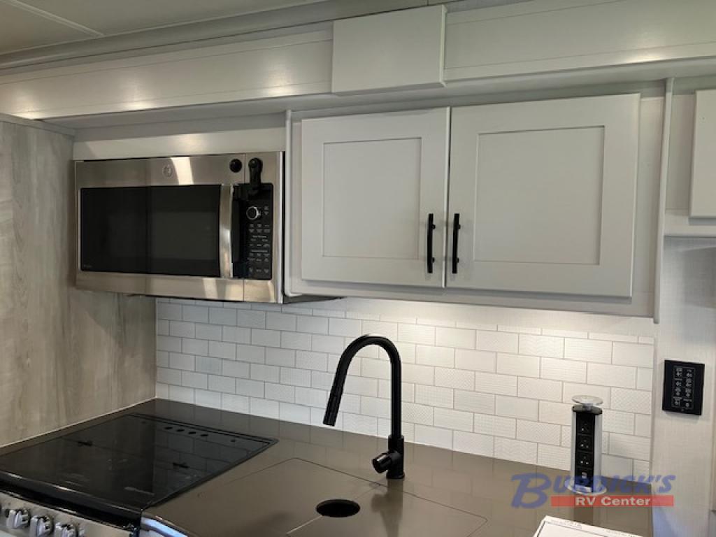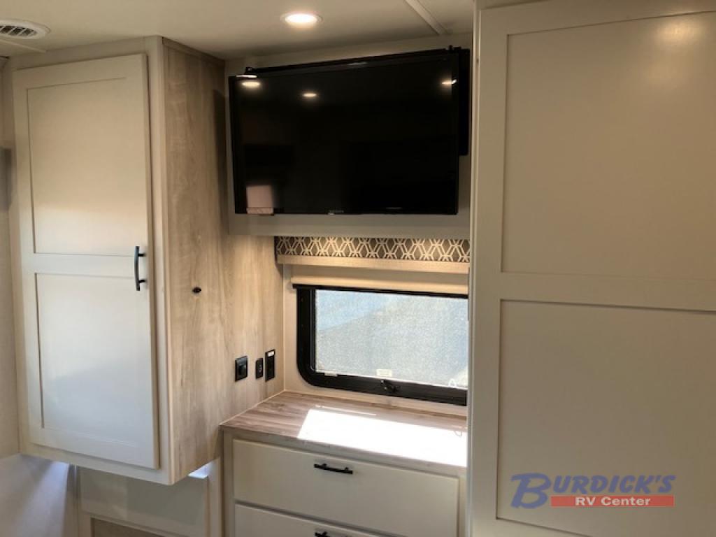 Whether you plan to go near or far, you'll stay comfortable in this spacious coach! There is a king bed slide out in the rear bedroom, plus dual wardrobes, dual nightstands, and your own 32" TV. Each morning, you can freshen up in the full bath that includes a glass shower door, then head to the kitchen for breakfast. There is a convection microwave, a gas range, plus a 16 cu. ft. residential refrigerator with an ice maker for convenience. The 64" sofa sleeper and Dream Dinette provide a place to dine, relax, and sleep additional guest, and you might want to add the cab-over bunk option for the little ones. Spend your evenings outdoors under the armless patio awning with LED lighting and watch a movie on the exterior 32" TV!