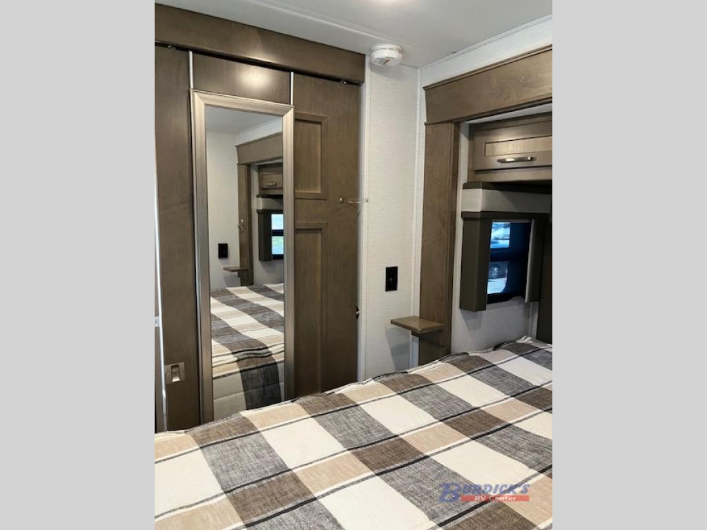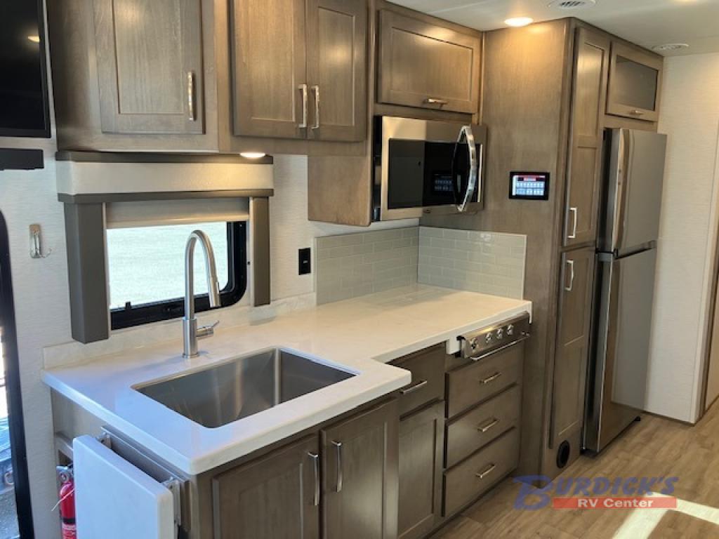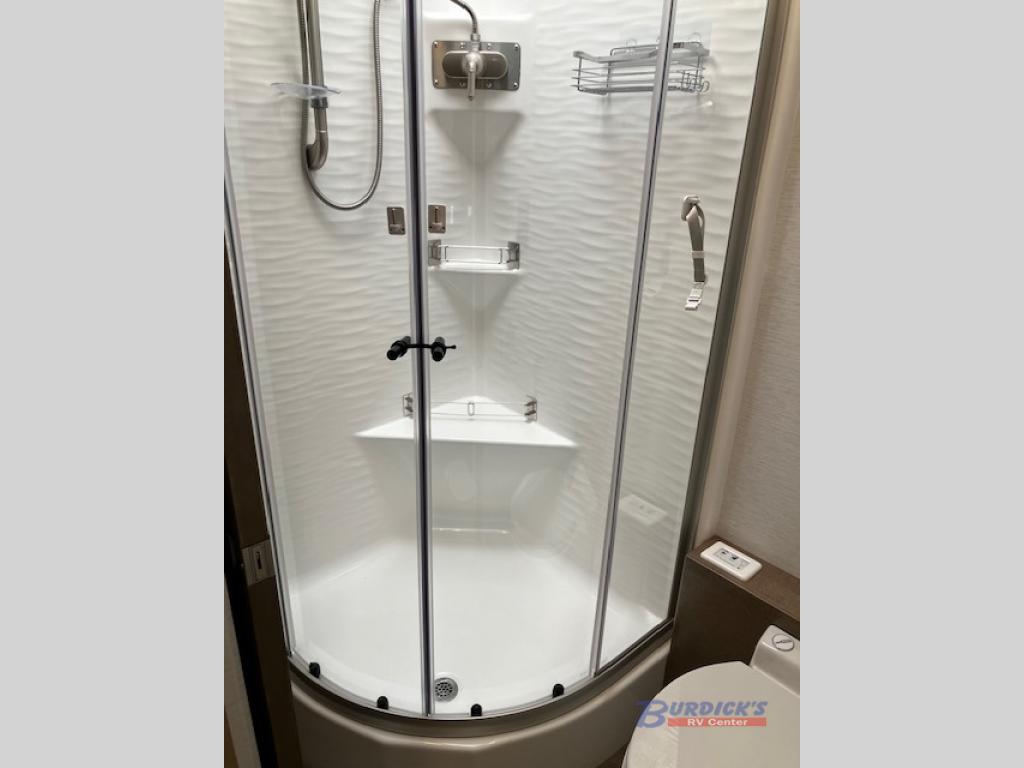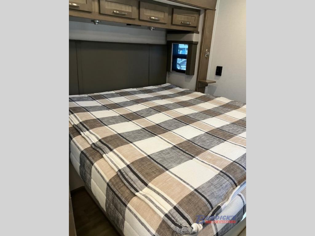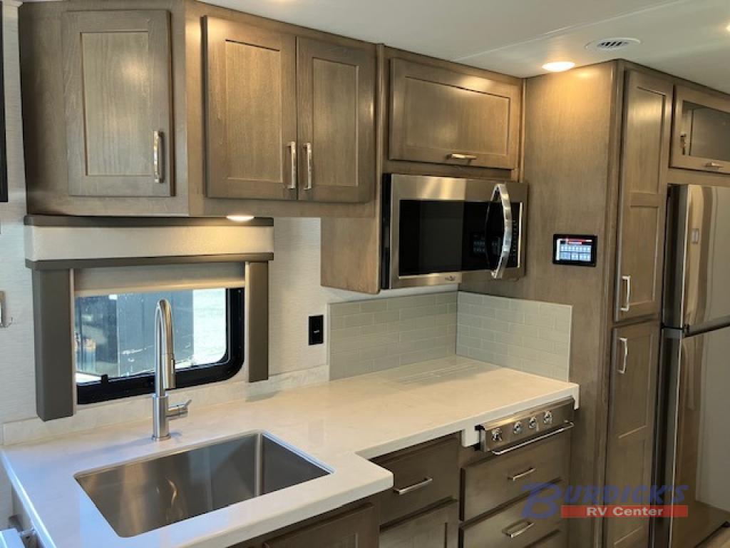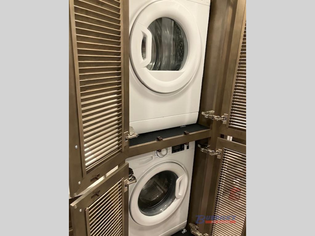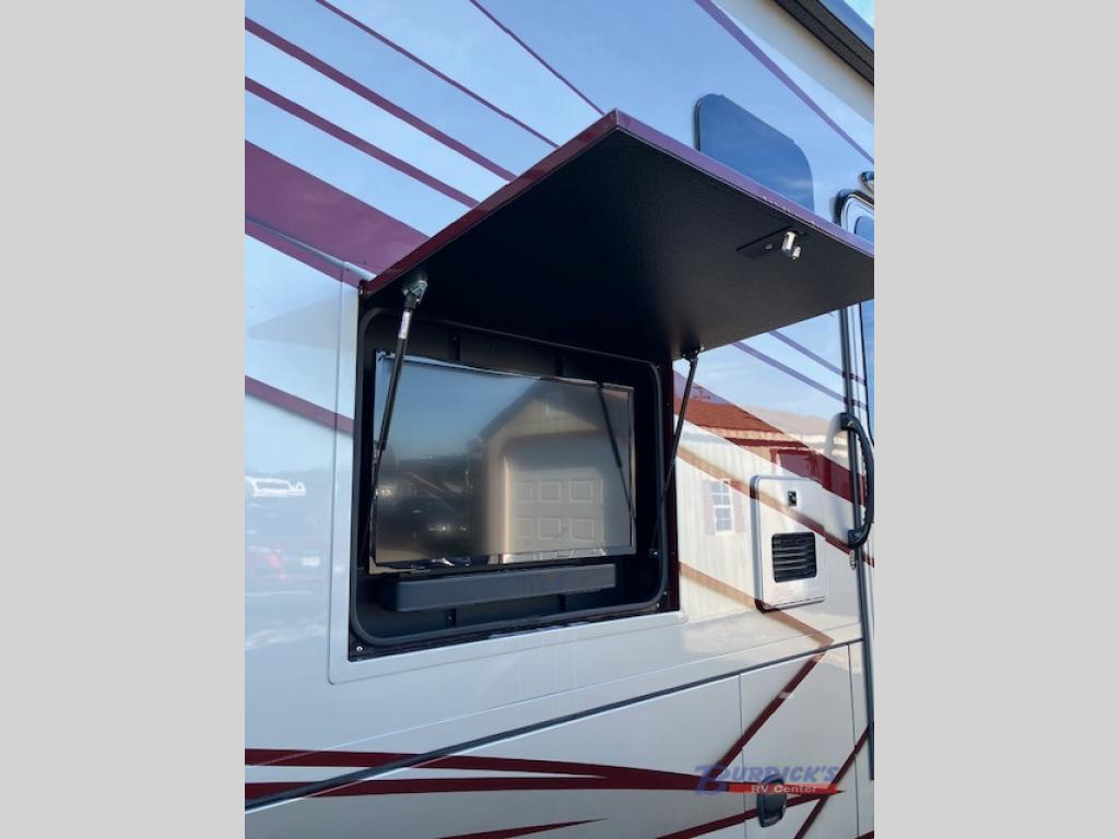 You will experience comfort and luxury with this motorhome! The rear private bedroom has a 72" x 74" king bed across from a 32" Smart LED TV with a dresser below and closets on either side, plus it leads into the separated bathroom. The bathroom has a radius shower with a skylight above for natural lighting as you get ready and a closet that pre-wired and plumbed for an optional washer and dryer for clean clothes throughout your entire trip. The sofa sleeper and booth dinette offer a comfortable place to relax and convert to sleeping space. Grab a cold beverage from the 18 cu. ft. residential stainless steel refrigerator then head to the exterior entertainment center to watch the big game on the 32" Smart LED TV with a sound bar on a swivel and USB charging!