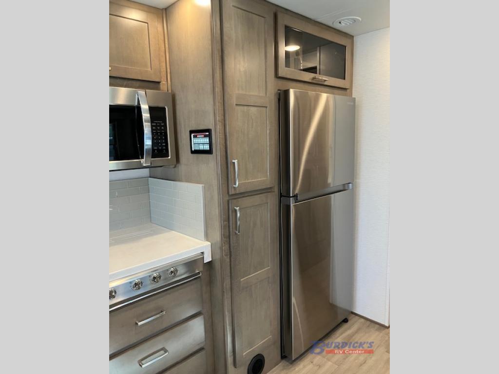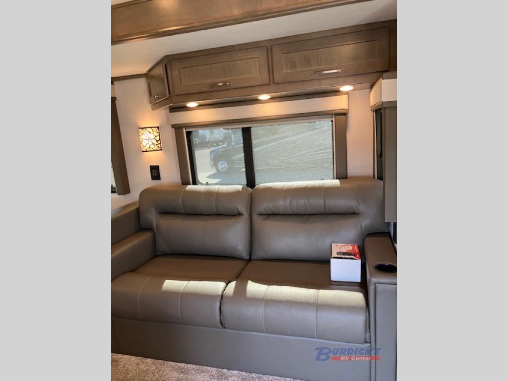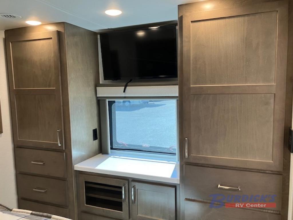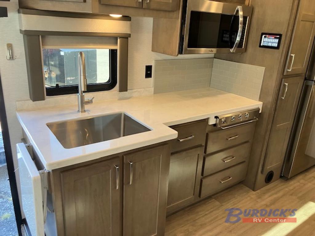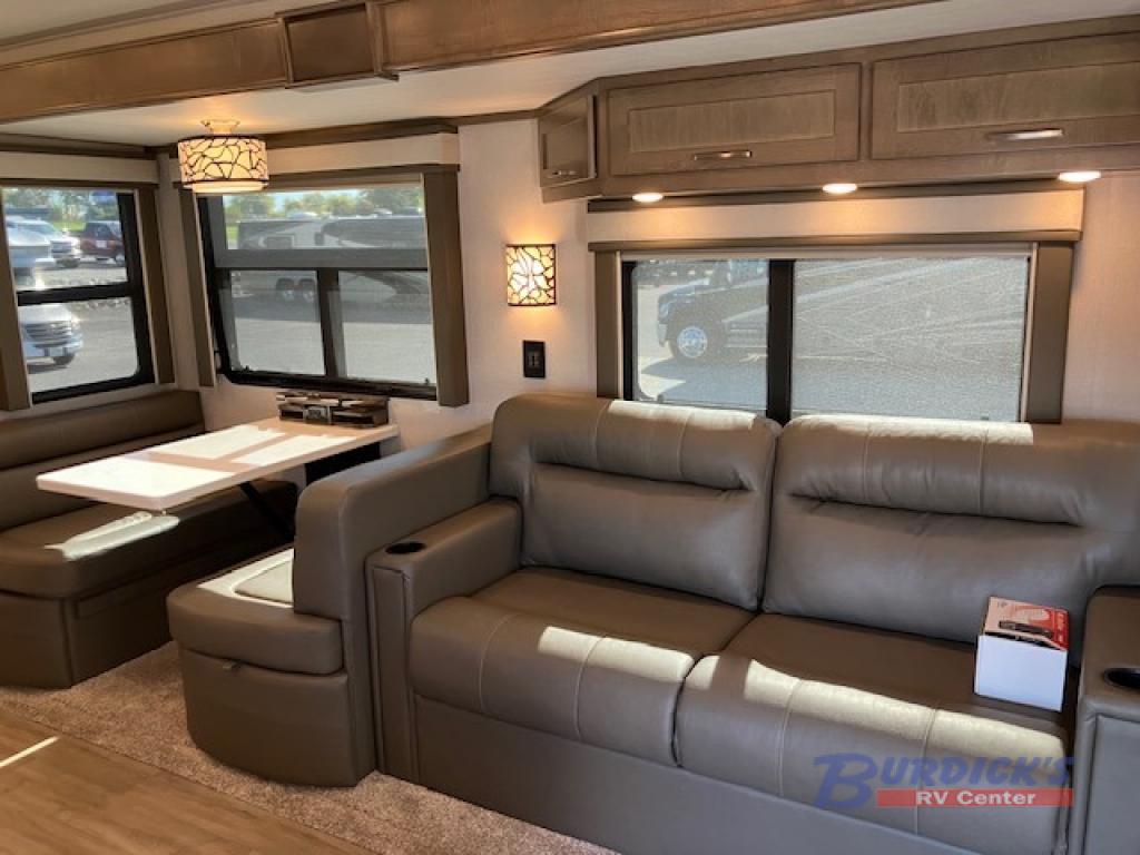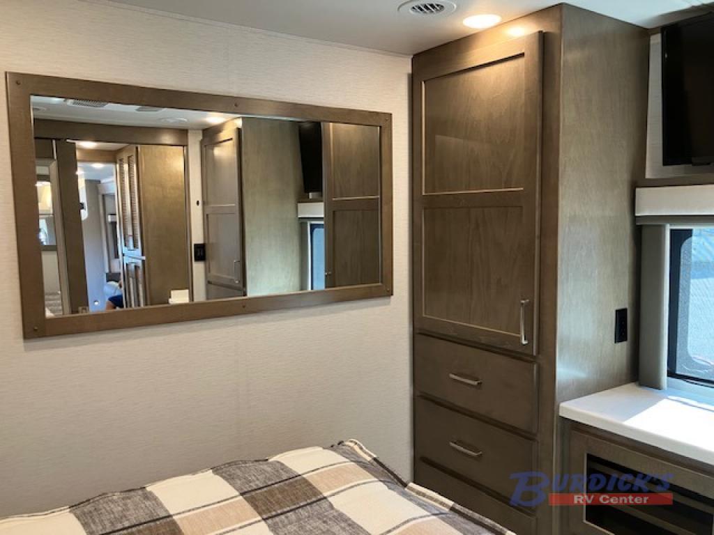 You will experience comfort and luxury with this motorhome! The rear private bedroom has a 72" x 74" king bed across from a 32" Smart LED TV with a dresser below and closets on either side, plus it leads into the separated bathroom. The bathroom has a radius shower with a skylight above for natural lighting as you get ready and a closet that pre-wired and plumbed for an optional washer and dryer for clean clothes throughout your entire trip. The sofa sleeper and booth dinette offer a comfortable place to relax and convert to sleeping space. Grab a cold beverage from the 18 cu. ft. residential stainless steel refrigerator then head to the exterior entertainment center to watch the big game on the 32" Smart LED TV with a sound bar on a swivel and USB charging!