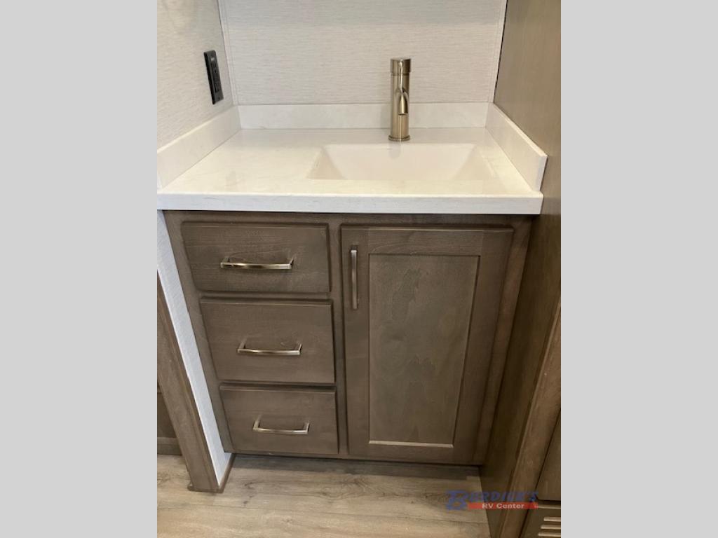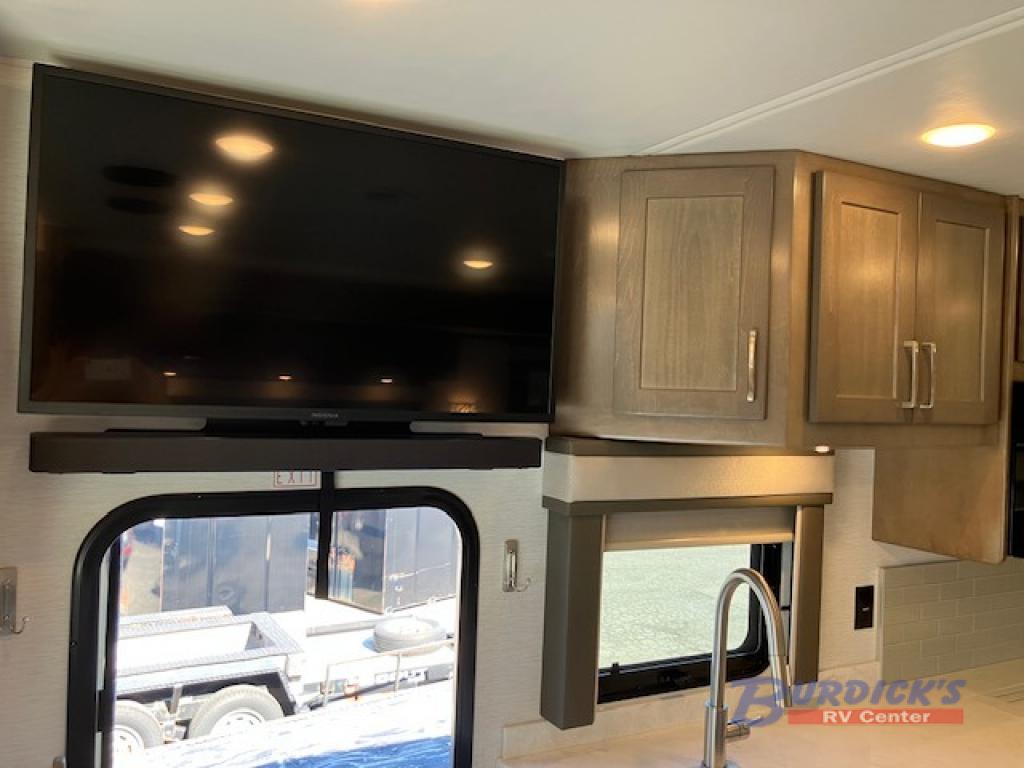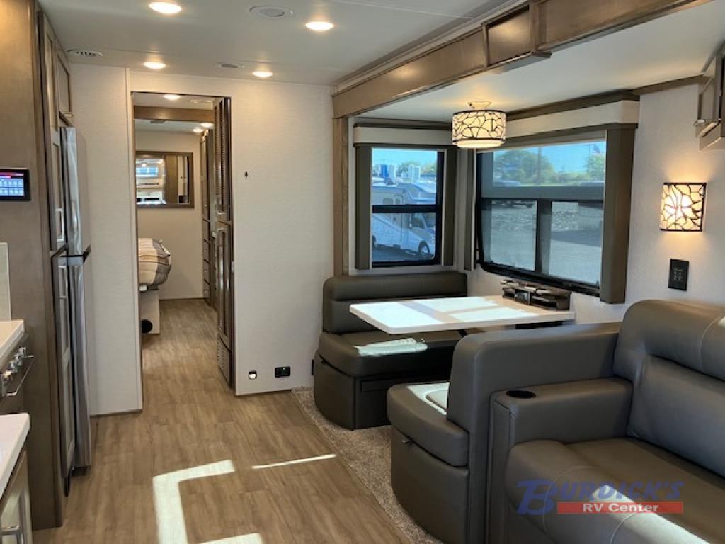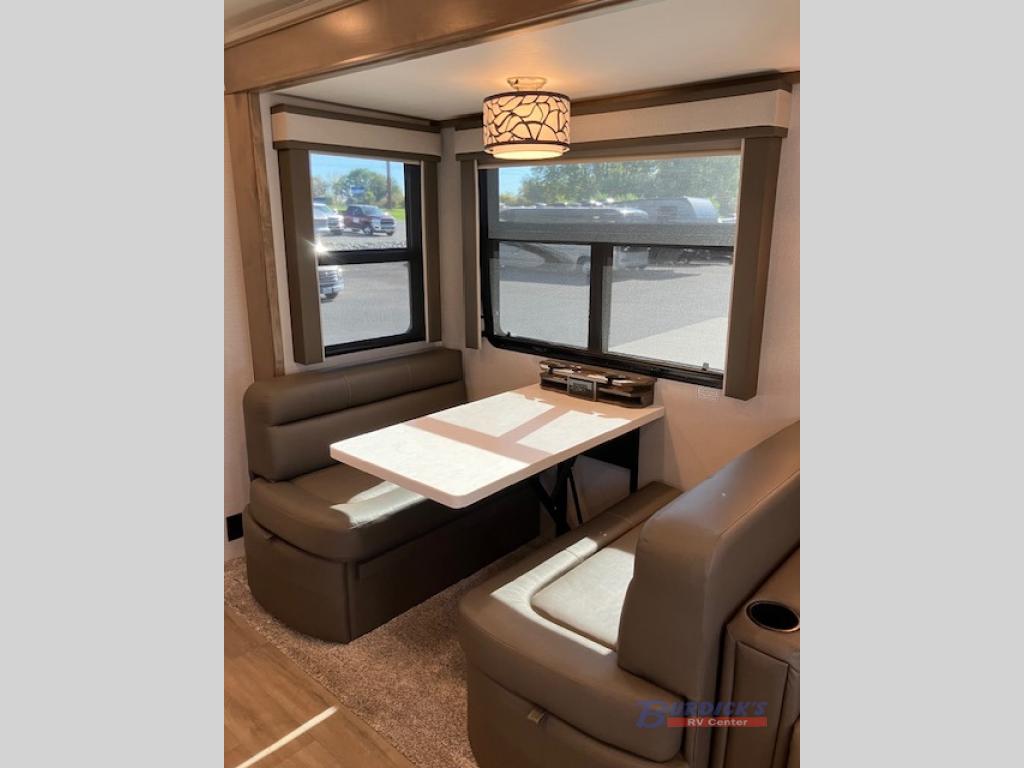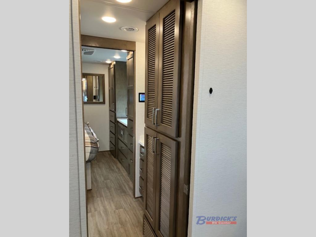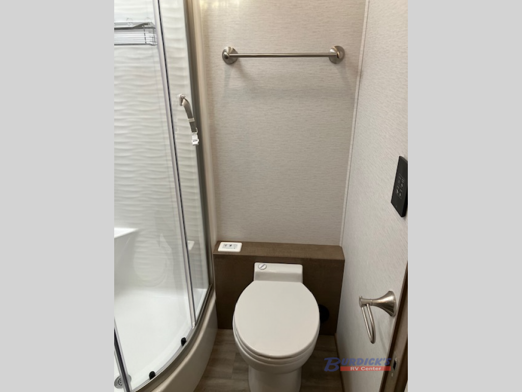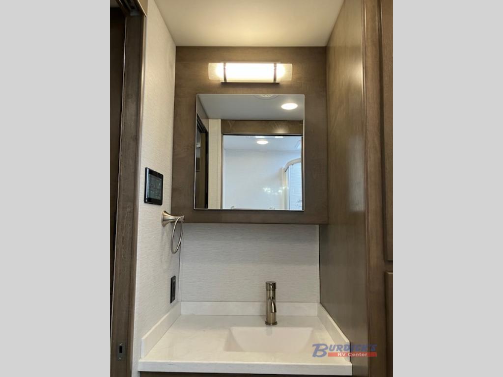 You will experience comfort and luxury with this motorhome! The rear private bedroom has a 72" x 74" king bed across from a 32" Smart LED TV with a dresser below and closets on either side, plus it leads into the separated bathroom. The bathroom has a radius shower with a skylight above for natural lighting as you get ready and a closet that pre-wired and plumbed for an optional washer and dryer for clean clothes throughout your entire trip. The sofa sleeper and booth dinette offer a comfortable place to relax and convert to sleeping space. Grab a cold beverage from the 18 cu. ft. residential stainless steel refrigerator then head to the exterior entertainment center to watch the big game on the 32" Smart LED TV with a sound bar on a swivel and USB charging!