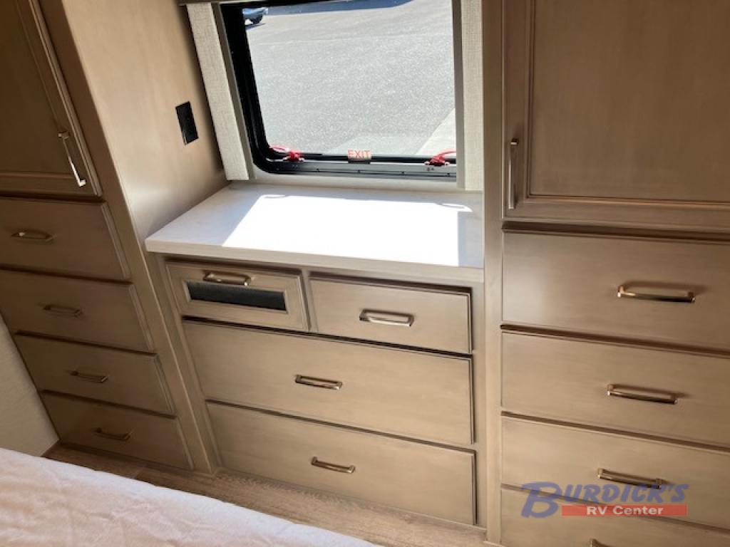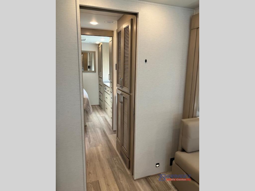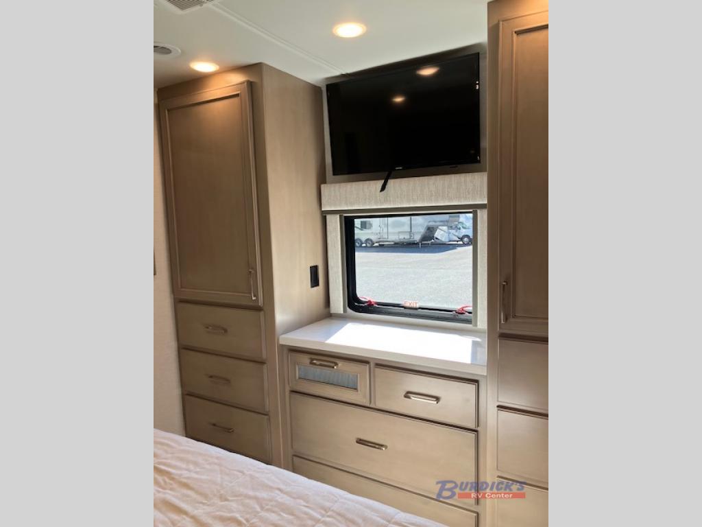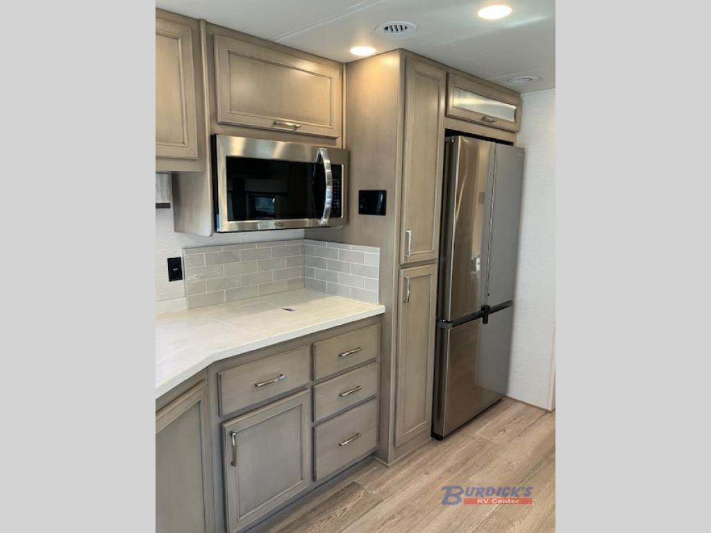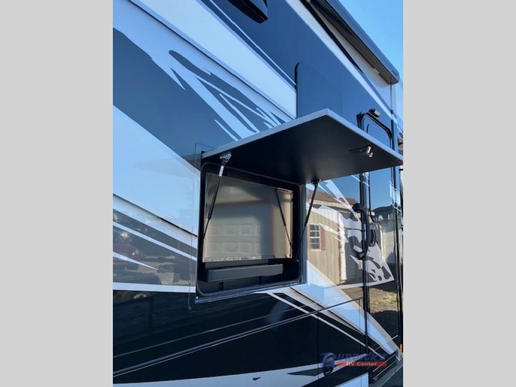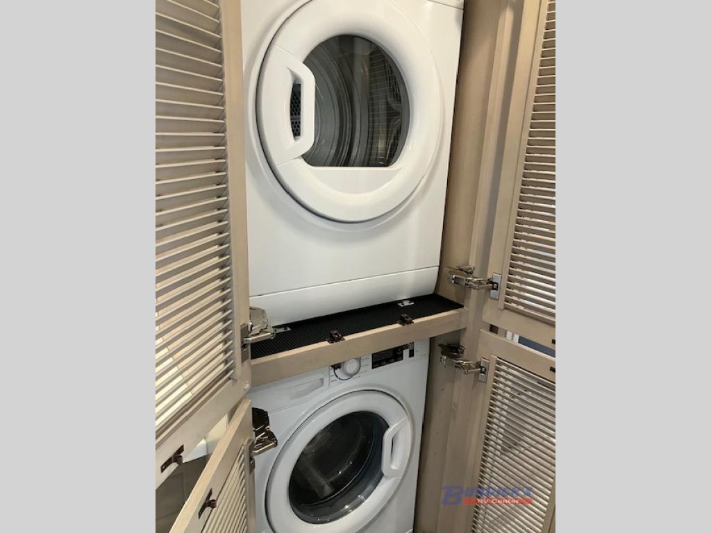 Whether you travel while you work or enjoy long-trips in your RV, this coach provides all the luxury, flexibility and comfort you could want! The main living and kitchen area is spacious with a furniture slide which includes a booth dinette and a slide-a-bed sofa which both offer sleeping space when needed for guests. The cook will love using the stainless steel convection microwave oven and the induction cooktop when making meals, and the French door residential refrigerator will hold lots of cold food. The separated bathroom allows two people to get ready at once, and the mini-king bed slide gives you more floor space in the bedroom to get to the closets and dresser. You will find a 32" 4K Smart LED TV in the bedroom to watch before bedtime, and the exterior offers a 32" LED TV to watch the big game while relaxing under the electric awning with LED lights. And you might like to add the washer/dryer option to the prepped closet to keep everything clean while on the road.