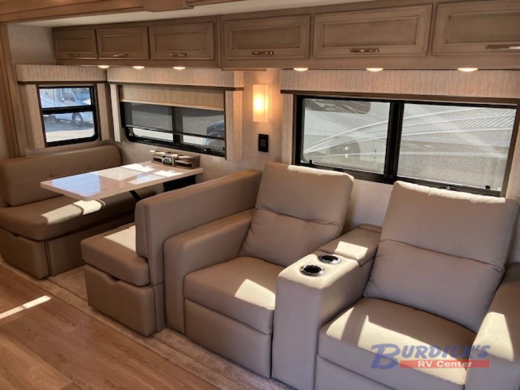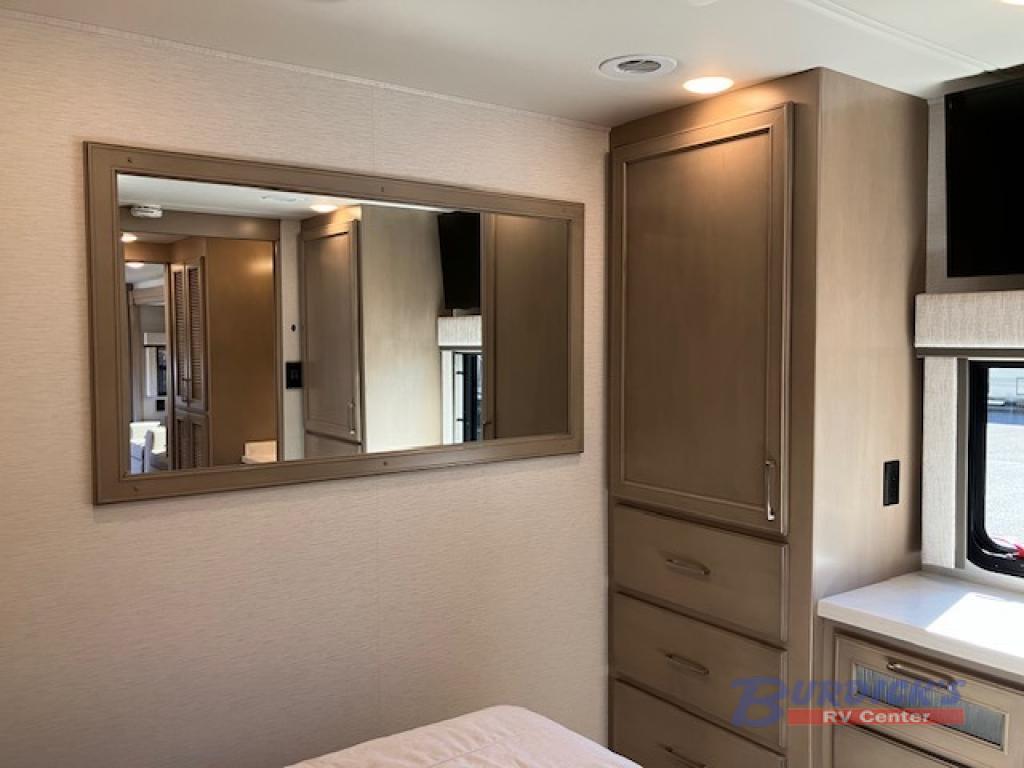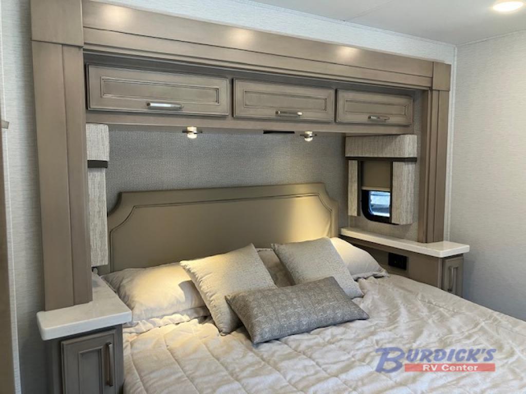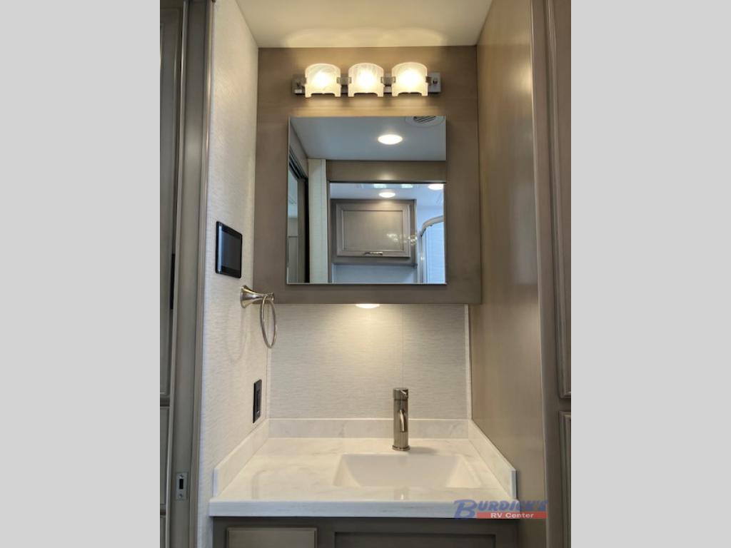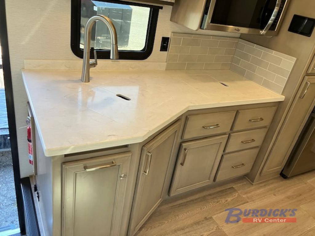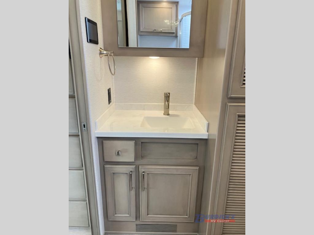 Whether you travel while you work or enjoy long-trips in your RV, this coach provides all the luxury, flexibility and comfort you could want! The main living and kitchen area is spacious with a furniture slide which includes a booth dinette and a slide-a-bed sofa which both offer sleeping space when needed for guests. The cook will love using the stainless steel convection microwave oven and the induction cooktop when making meals, and the French door residential refrigerator will hold lots of cold food. The separated bathroom allows two people to get ready at once, and the mini-king bed slide gives you more floor space in the bedroom to get to the closets and dresser. You will find a 32" 4K Smart LED TV in the bedroom to watch before bedtime, and the exterior offers a 32" LED TV to watch the big game while relaxing under the electric awning with LED lights. And you might like to add the washer/dryer option to the prepped closet to keep everything clean while on the road.